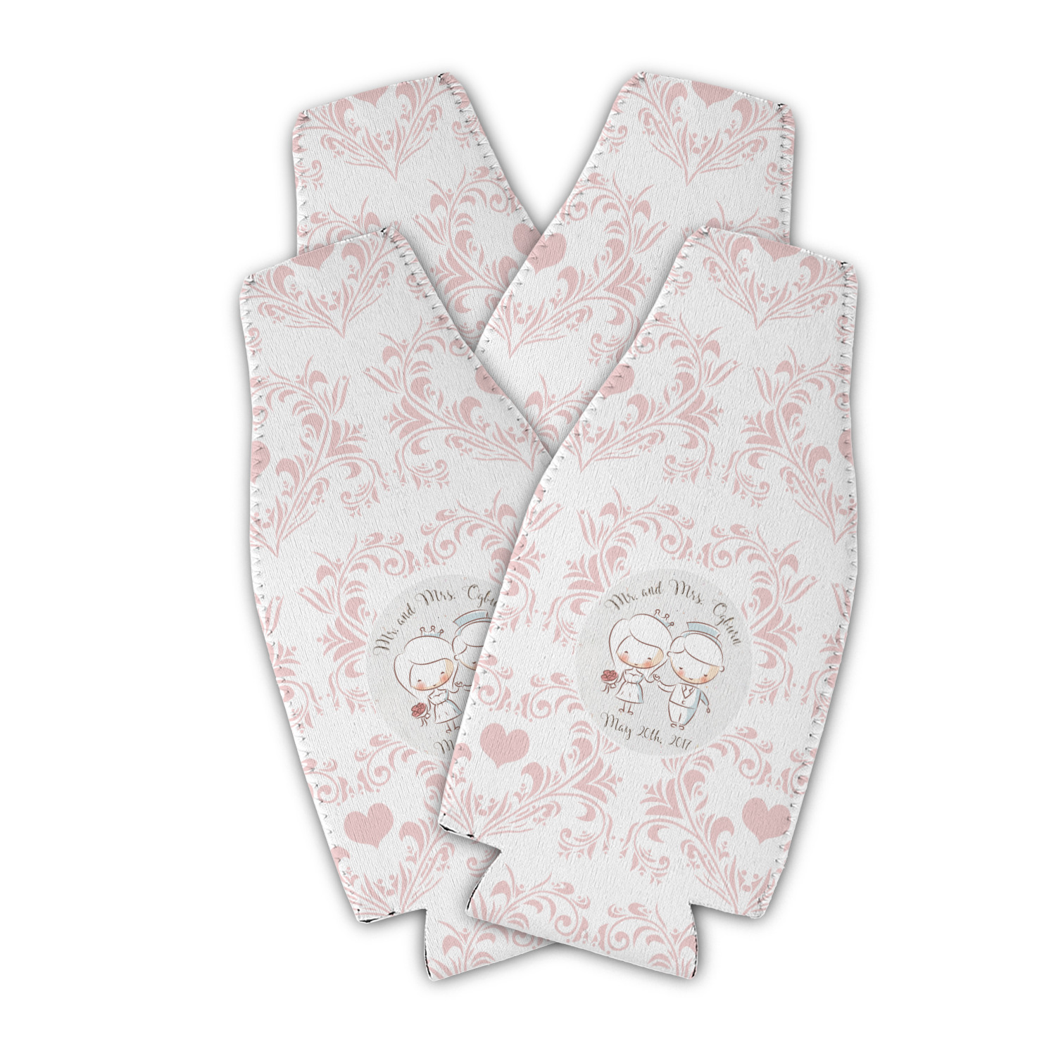 This design has an adorable bride and groom at the center of attention. They sit holding hands on a speckle textured off-white background. Above and below them is where the personalization goes, with the bride and groom's names and wedding date or whatever you choose. The textured background is a circle that surrounds the bride and groom while another background sits behind this circle. The secondary background is a white and light pink heart damask pattern, which looks adorable with the couples and their sweet rosy cheeks.