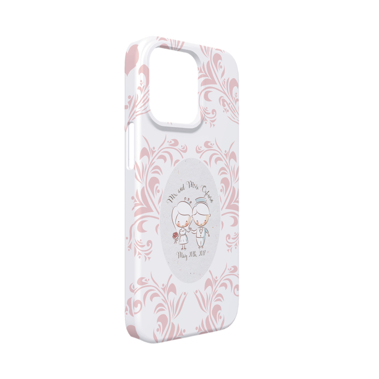 This design has an adorable bride and groom at the center of attention. They sit holding hands on a speckle textured off-white background. Above and below them is where the personalization goes, with the bride and groom's names and wedding date or whatever you choose. The textured background is a circle that surrounds the bride and groom while another background sits behind this circle. The secondary background is a white and light pink heart damask pattern, which looks adorable with the couples and their sweet rosy cheeks.