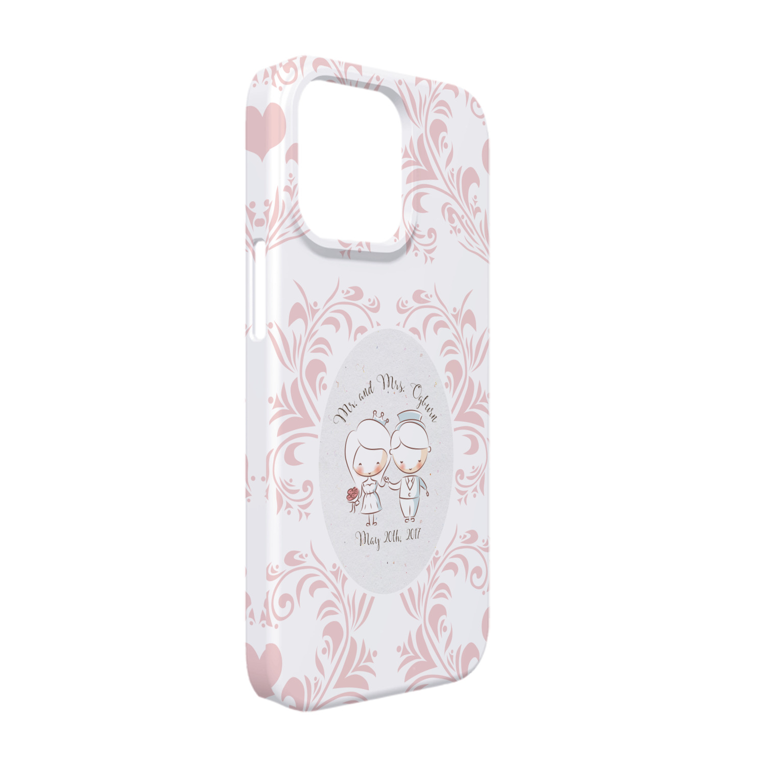This design has an adorable bride and groom at the center of attention. They sit holding hands on a speckle textured off-white background. Above and below them is where the personalization goes, with the bride and groom's names and wedding date or whatever you choose. The textured background is a circle that surrounds the bride and groom while another background sits behind this circle. The secondary background is a white and light pink heart damask pattern, which looks adorable with the couples and their sweet rosy cheeks.