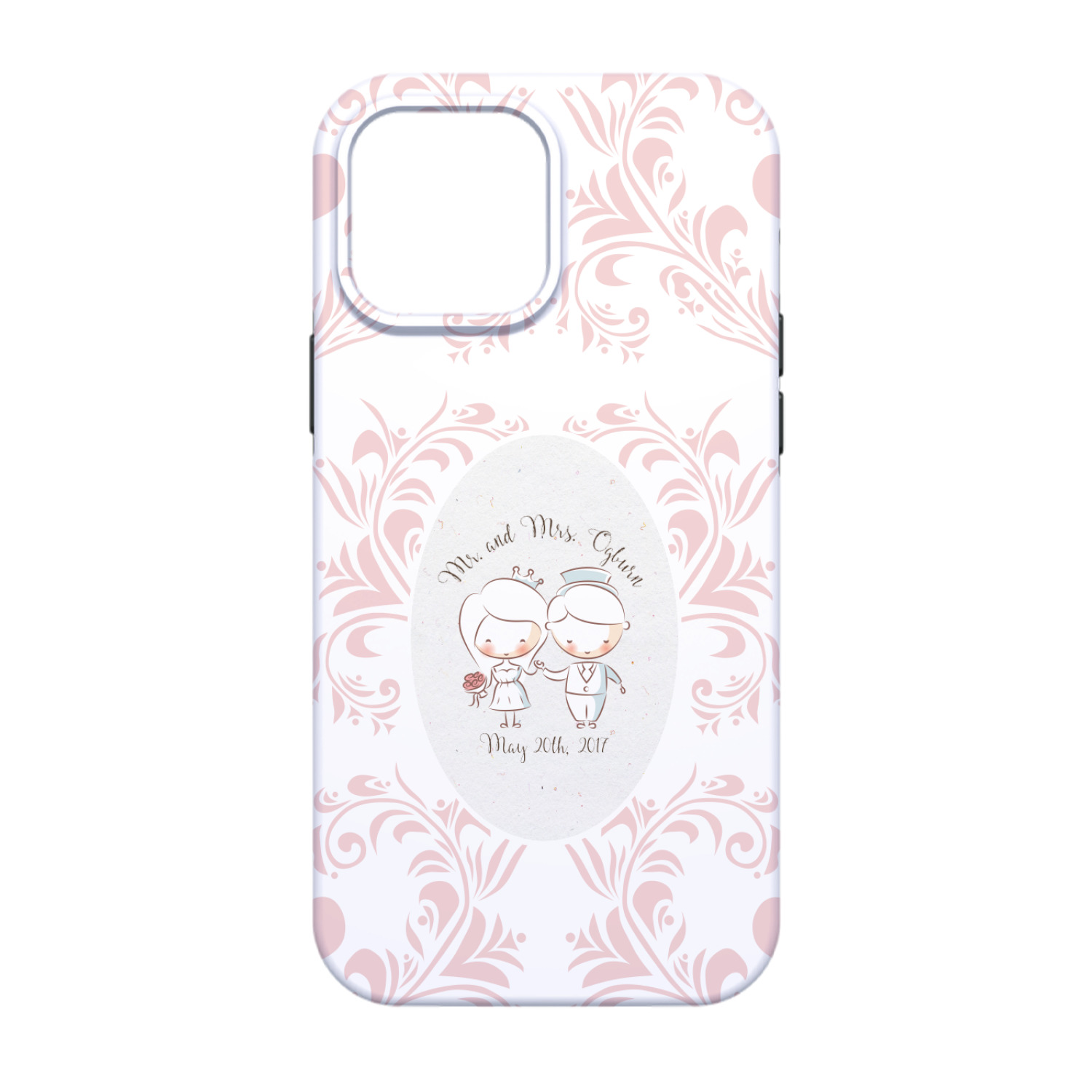 This design has an adorable bride and groom at the center of attention. They sit holding hands on a speckle textured off-white background. Above and below them is where the personalization goes, with the bride and groom's names and wedding date or whatever you choose. The textured background is a circle that surrounds the bride and groom while another background sits behind this circle. The secondary background is a white and light pink heart damask pattern, which looks adorable with the couples and their sweet rosy cheeks.