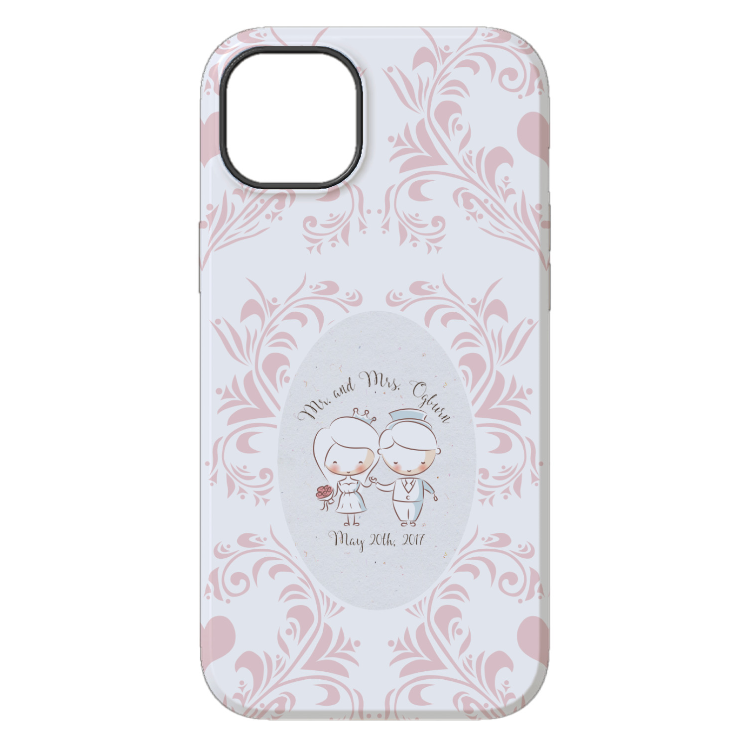 This design has an adorable bride and groom at the center of attention. They sit holding hands on a speckle textured off-white background. Above and below them is where the personalization goes, with the bride and groom's names and wedding date or whatever you choose. The textured background is a circle that surrounds the bride and groom while another background sits behind this circle. The secondary background is a white and light pink heart damask pattern, which looks adorable with the couples and their sweet rosy cheeks.