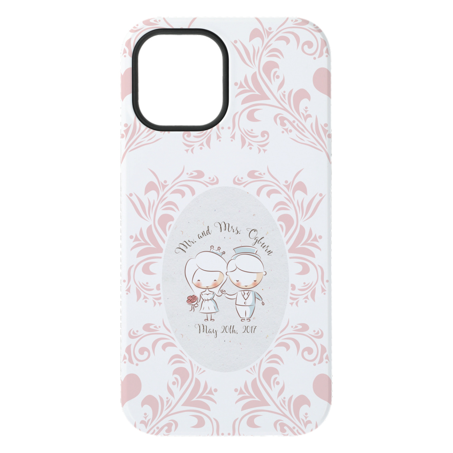 This design has an adorable bride and groom at the center of attention. They sit holding hands on a speckle textured off-white background. Above and below them is where the personalization goes, with the bride and groom's names and wedding date or whatever you choose. The textured background is a circle that surrounds the bride and groom while another background sits behind this circle. The secondary background is a white and light pink heart damask pattern, which looks adorable with the couples and their sweet rosy cheeks.