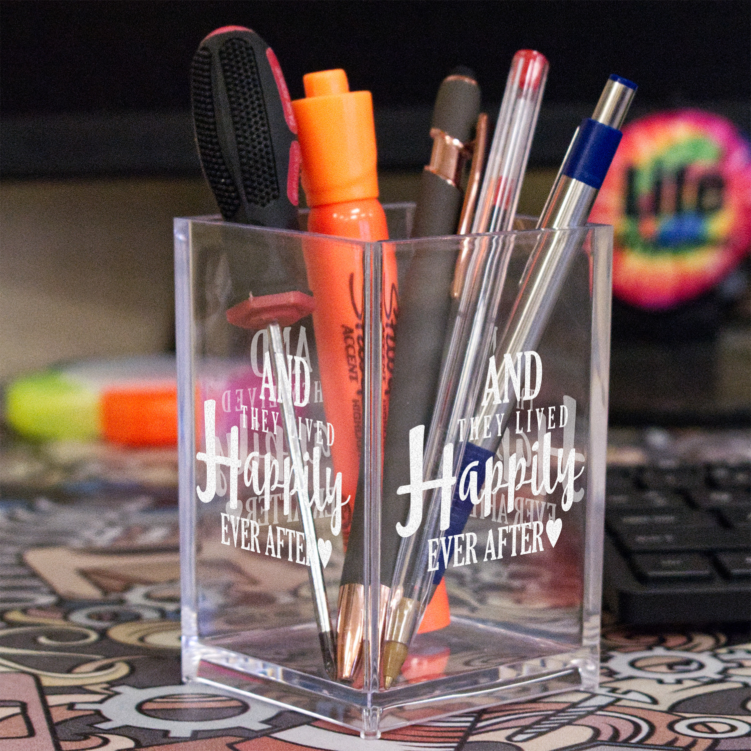Add a great accessory to your desk with one of these acrylic pen holders. A great way to store your writing utensils, and personalized to suit your needs.