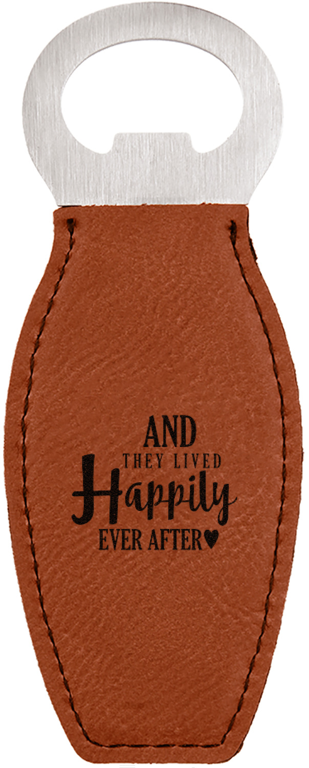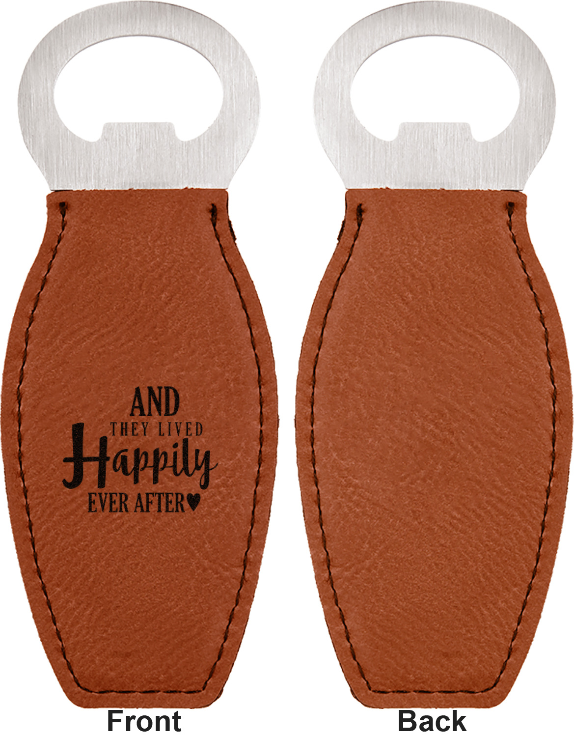 Built from stainless steel, these custom bottle openers are wrapped in a cognac-colored leatherette. Sharp, black stitching lines the edges for extra durability and a finished touch. Your personalization is laser-engraved onto the surface of this leatherette, leaving behind a crisp, black coloration. At 4.6 by 1.8 inches, this beer bottle opener gives you much of leverage when trying to open a stubborn bottle. On the opposite end of the opener, you'll find a magnet that you can use to display your new, unique bottle opener!