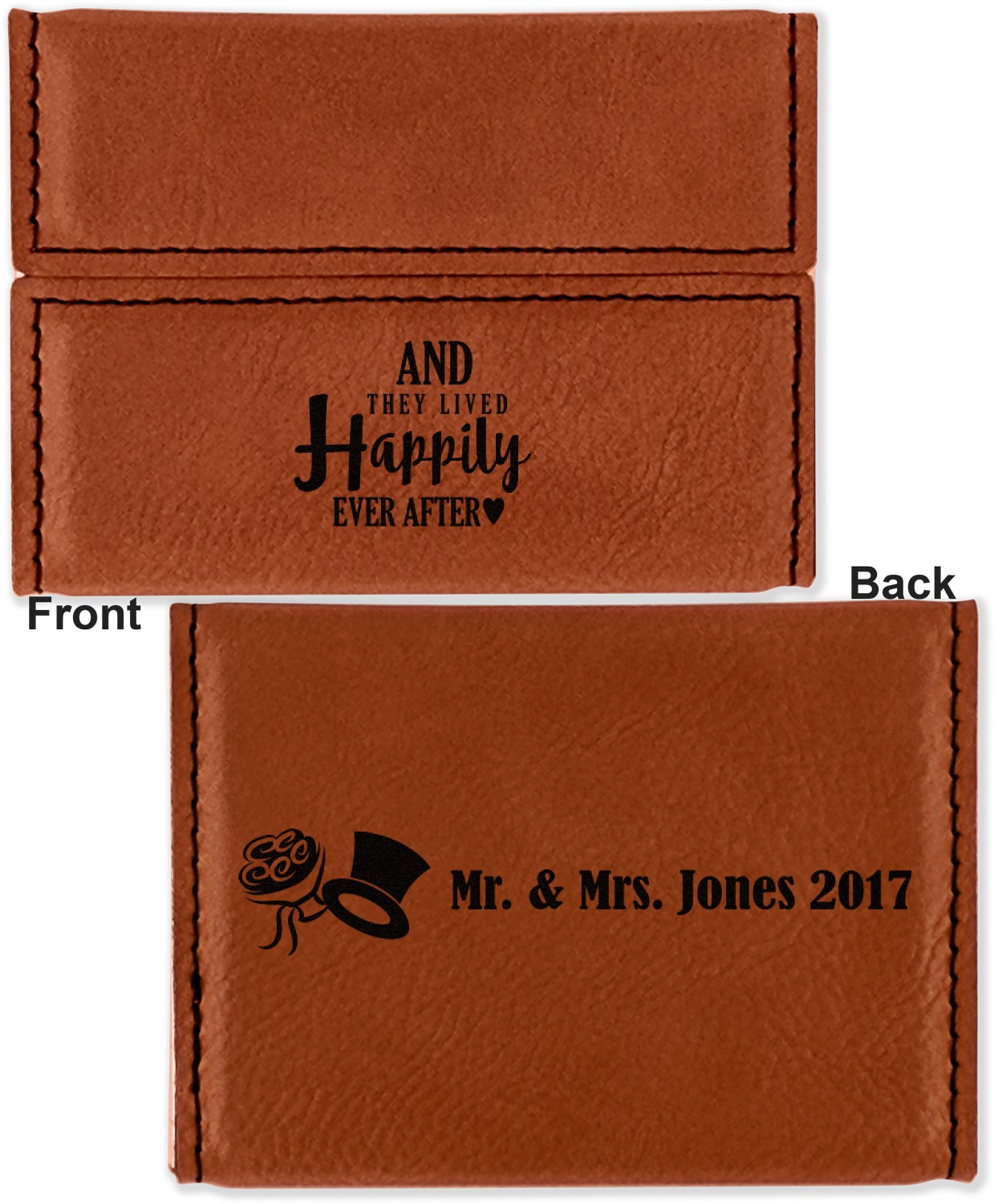 Your personalized design is laser engraved onto either the front, or the front and back of the card holder, depending on the model you purchase. Once engraved, the design will appear a darkened black against the cognac color of the leatherette.