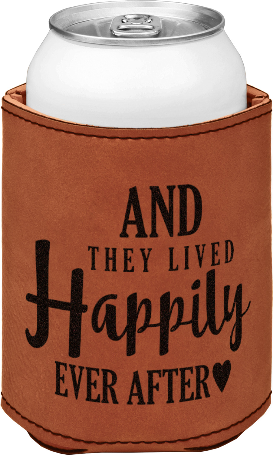 This can sleeve is made from a cognac-brown leatherette and stitched with a sturdy, black thread. A slim padding lines the inside of your can sleeve to allow for a better fit once your drink is inserted. The sleeve itself measures at 4 by 4.5 inches, allowing this custom can sleeve to accommodate most canned drinks. Your personalized design can be engraved on the front and back, or solely the front. When laser-engraved, your design appears as a black coloration which contrasts the leatherette nicely.