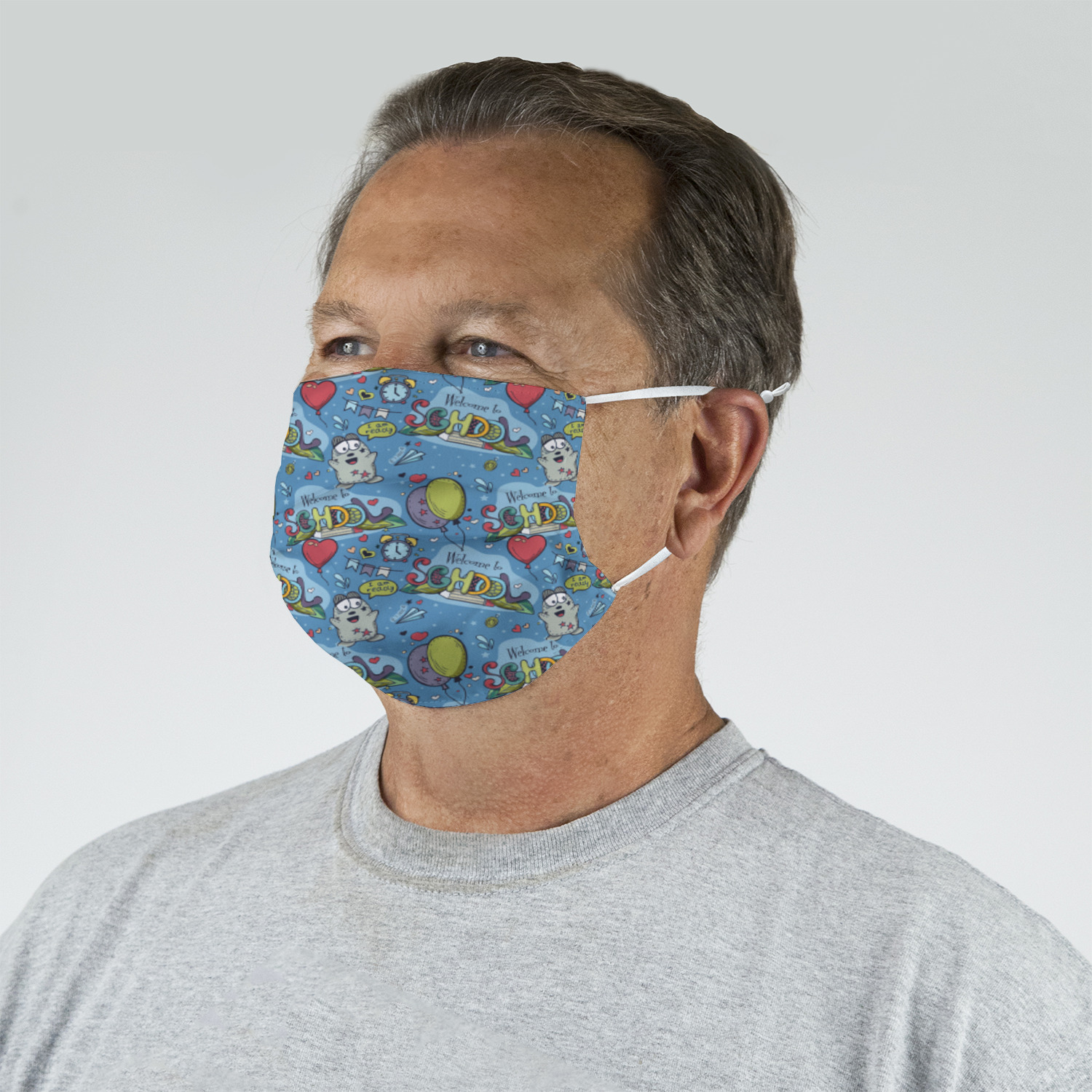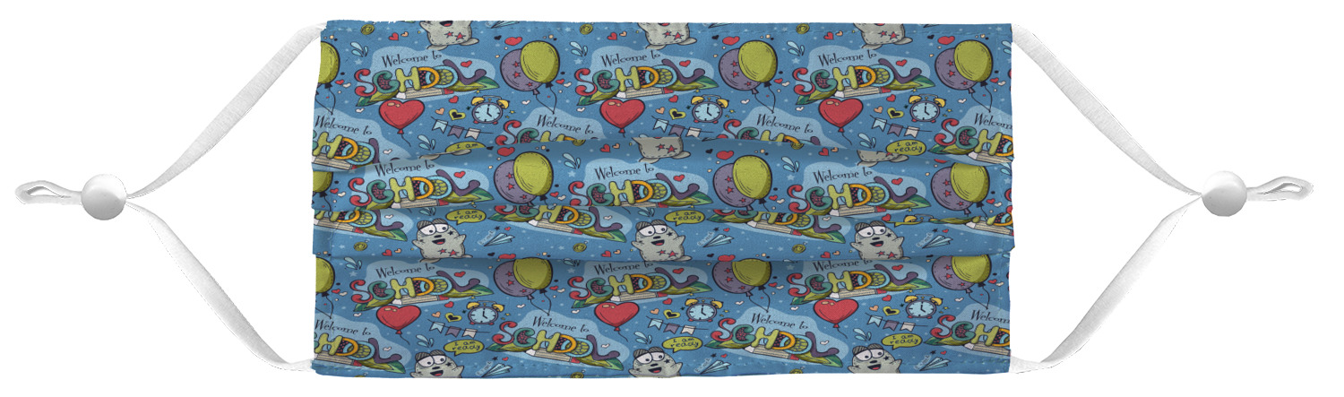 These fun face masks are 7" wide and 3.5" high. They feature pleats, adjustable ear loops, and are made with two layers of fabric. The top layer where your design is printed is a breathable polyester sheeting, while the inside layer is a soft microfiber polyester