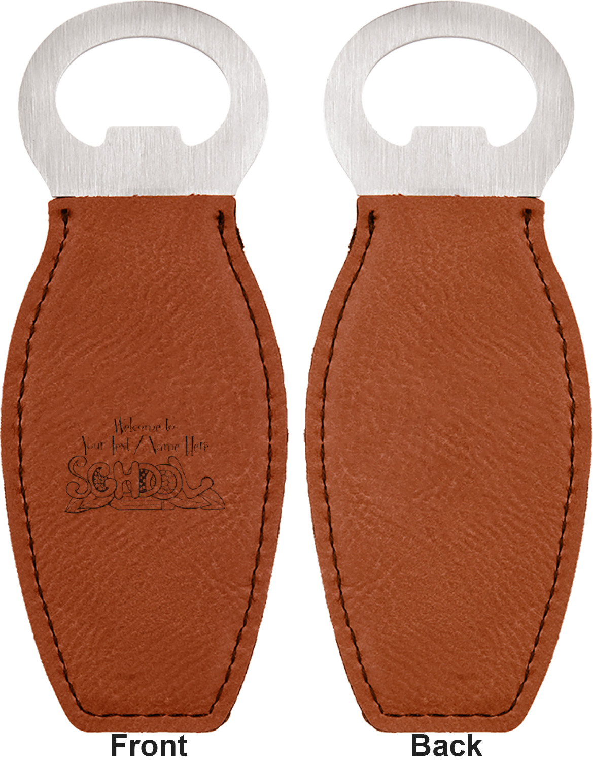 Built from stainless steel, these custom bottle openers are wrapped in a cognac-colored leatherette. Sharp, black stitching lines the edges for extra durability and a finished touch. Your personalization is laser-engraved onto the surface of this leatherette, leaving behind a crisp, black coloration. At 4.6 by 1.8 inches, this beer bottle opener gives you much of leverage when trying to open a stubborn bottle. On the opposite end of the opener, you'll find a magnet that you can use to display your new, unique bottle opener!