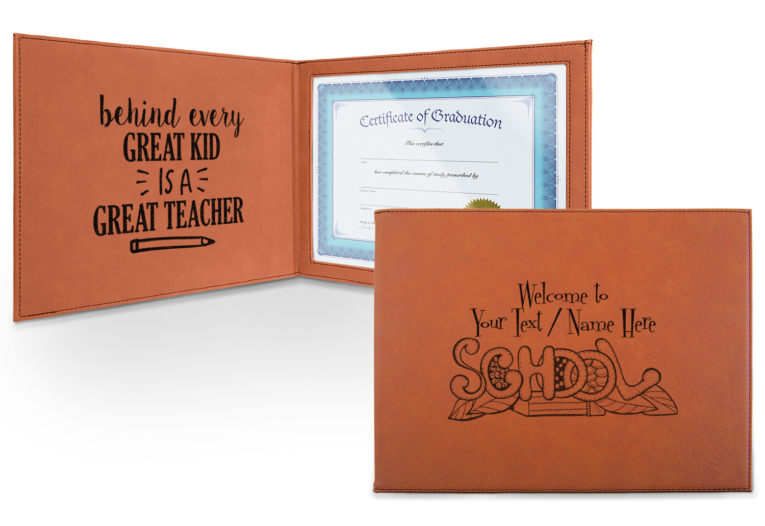 This cognac-colored, leatherette certificate jacket is the ideal way to display or store your hard-earned certificate. When closed, the custom certificate holder measures at 12 by 9 inches. The interior of the certificate cover includes a clear, vinyl window to encase your diploma. The window measures at around 10.5 by 7.5 inches and can accommodate a diploma that measures at up to 8.5 by 11 inches. You can either choose to have your customization laser engraved on the front and interior, or solely the front.