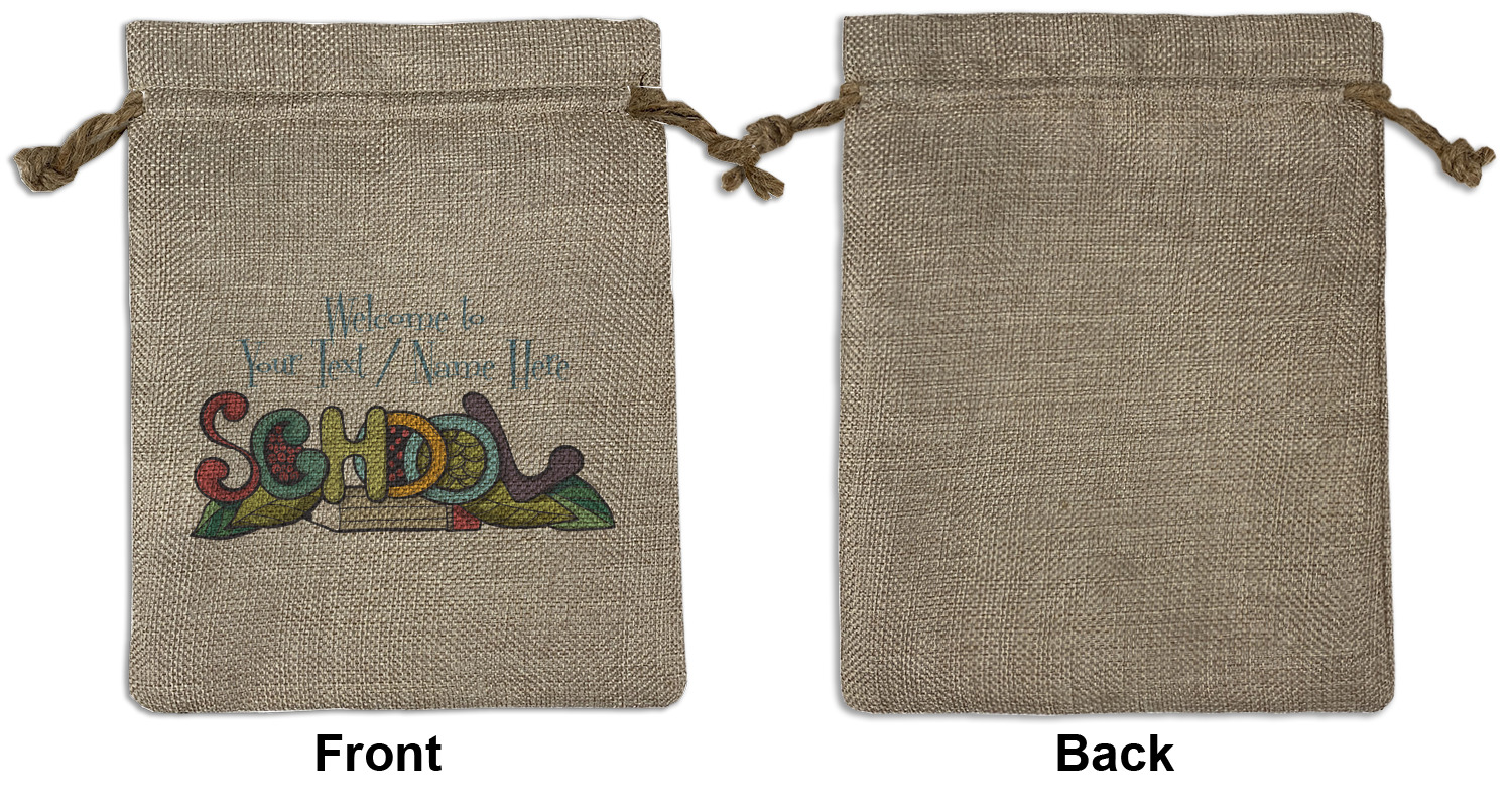 We sell our Burlap Gift Bags in 3 variant sized bags. Made with burlap polyester, each personalized bag can be secured with a twine drawstring pull. Your custom design is available to print on one side or both sides - completely up to you! The sizes of the bags measure approximately 4.5" x 6.5" for the smallest size, 6.5" x 8.0" for the medium size, and 6.5" x 13.5" for the large-sized bag.