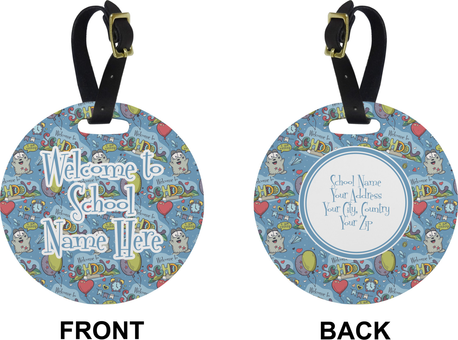 These personalized bag tags are sold in a variety of shapes, so that you may find the product that meets your vision exactly. We sell a round luggage tag, which measures at approximately 4" x 4". Our square luggage tag is about 3.5" x 3.5", while our rectangular version is 2.75" x 4 ".