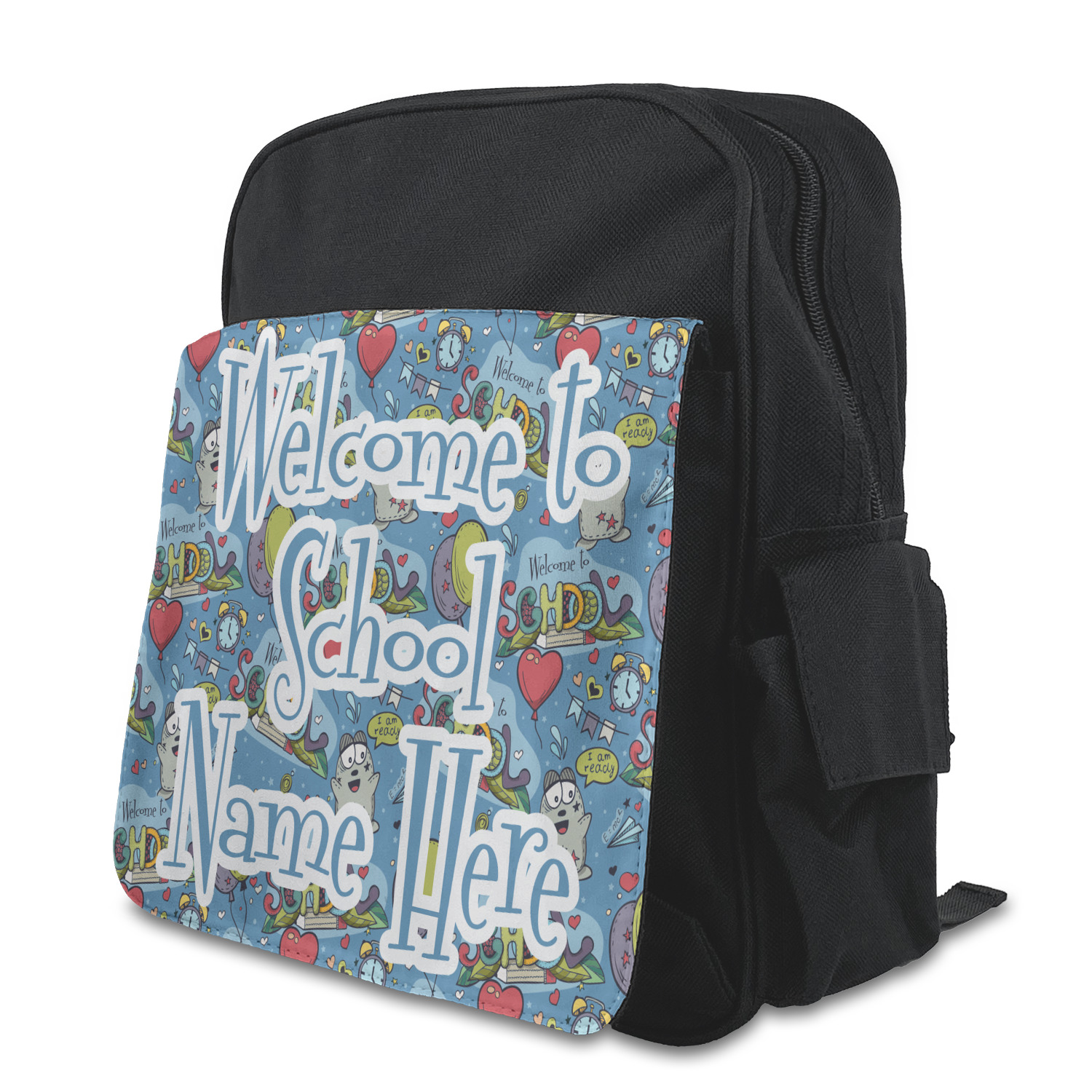 The backpack is a small size perfect for toddlers up to Kindergarten age. The zipper main pouch can hold most of their items and they have one side pocket with a flap to close it and the other side has a mesh pocket perfect for a water bottle. The outside has a customizable flap with a smaller pouch to hold more items. The straps are adjustable to fit your toddlers shoulders and they have a loop on top for hanging for storage.