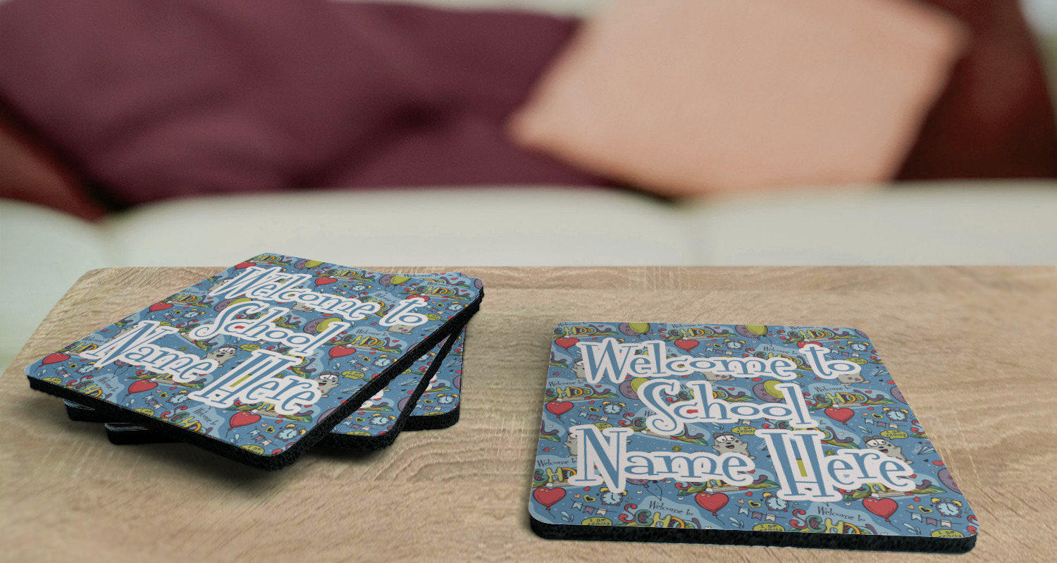 These drink coasters have a smooth, polyester top and a textured, rubber backing on its bottom. The non-slip rubber backing underneath works to keep any spills at bay. At 4 by 4 by 0.25 inches thick, these custom coasters are a suitable size for most drinkware. Your personalization is displayed atop the face of the cup coaster. We sell these rubber coasters in two different shapes: square and round. You can buy each shape as singulars or as a set of 4.