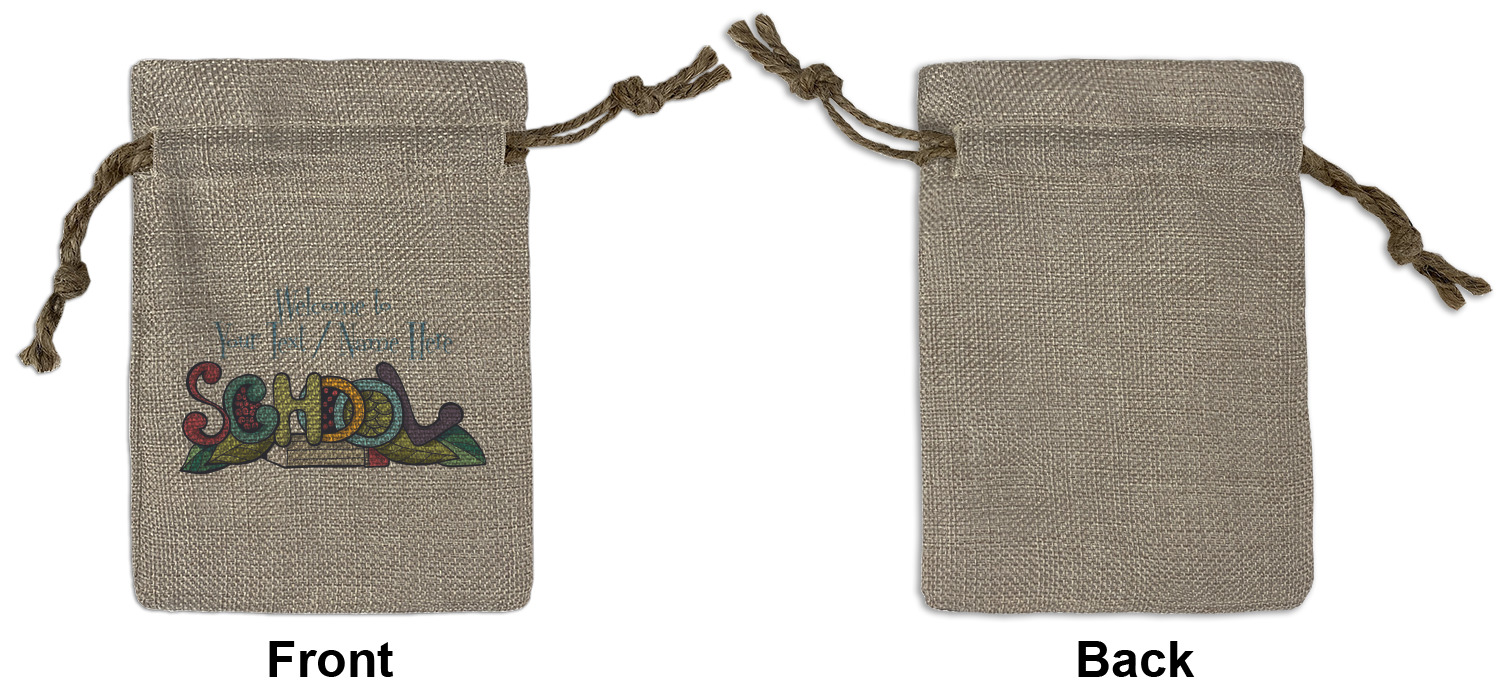 We sell our Burlap Gift Bags in 3 variant sized bags. Made with burlap polyester, each personalized bag can be secured with a twine drawstring pull. Your custom design is available to print on one side or both sides - completely up to you! The sizes of the bags measure approximately 4.5" x 6.5" for the smallest size, 6.5" x 8.0" for the medium size, and 6.5" x 13.5" for the large-sized bag.