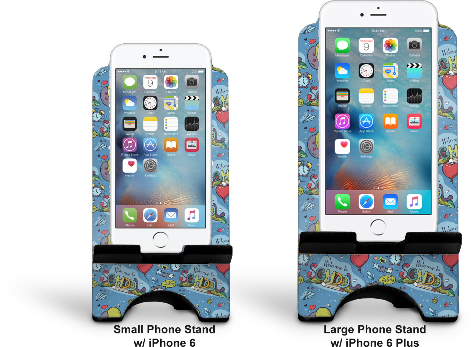 To meet your needs, we offer four variations of this IPhone stand. The backboard of the first version is shaped as a plain, yet sleek rectangle, and is available in two sizes. Our smaller size is approximately 4 by 3.25 by 7 inches, while the larger model is 4 by 3.77 by 8.5 inches. Alongside this model, we also provide you with a more decorative option. The upper part of our second version features a curved edge, for a classy, suave appearance. This phone holder is also sold in two sizes: a smaller version, which is 4 by 3.25 by 7 inches, and our larger model, which is 4 by 3.77 by 8.5 inches. Both models will support large phones, but the larger model is better if you wish to proudly display your personalized design.