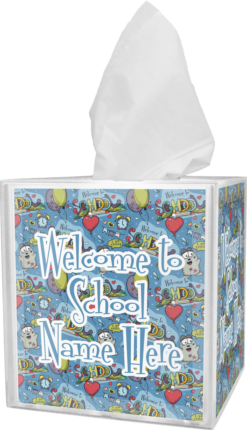 These tissue holders are built from durable acrylic and display your unique personalization on fine-quality vinyl inserts placed within the four sides and top. The box features two pieces, allowing you to easily switch out tissue boxes. On the sides, youll find ridges that ensure the top and base fit securely in place. The bottom of these tissue box holders has four, rubber, non-slip pads to prevent the box from scuffing any surface you decide to display it on. Each box can fit a standard 5 by 5-inch box of tissues.