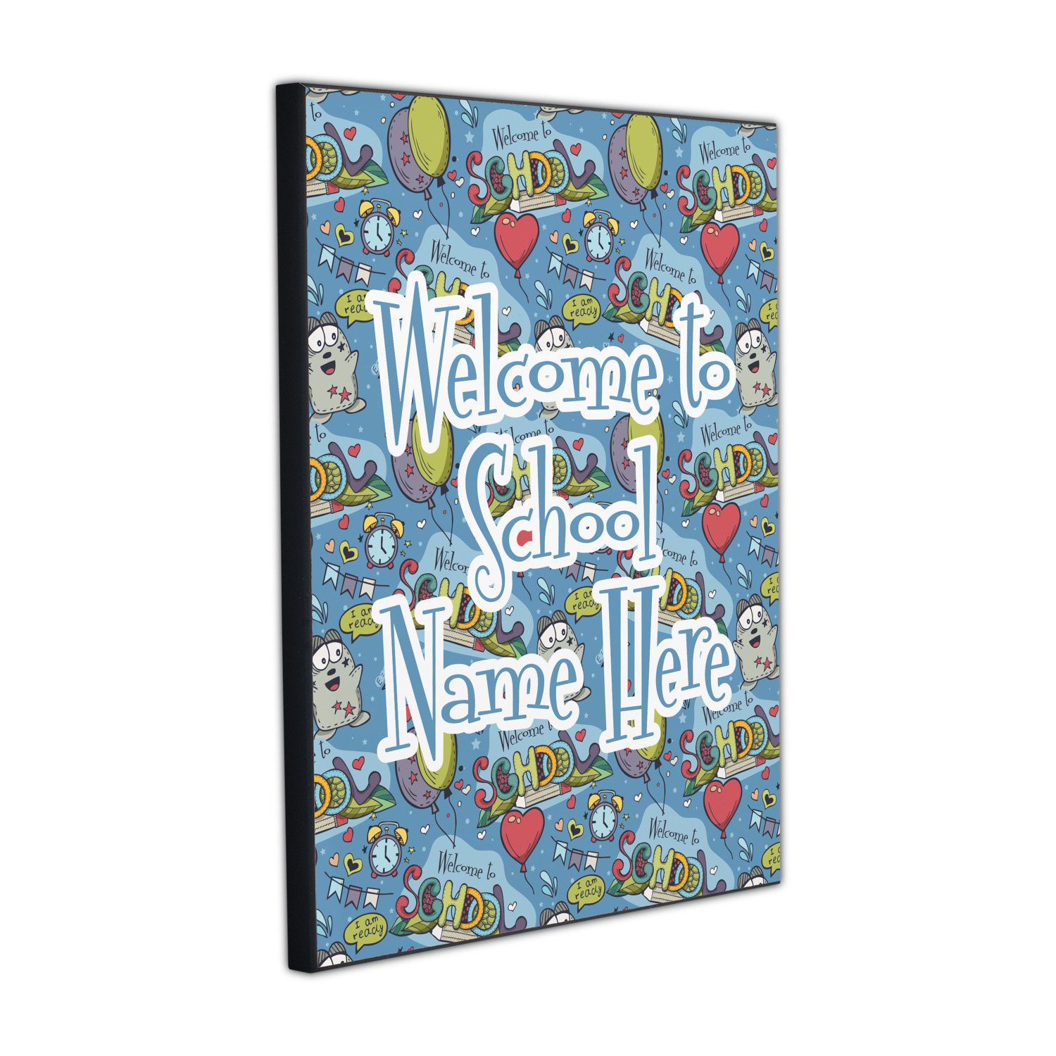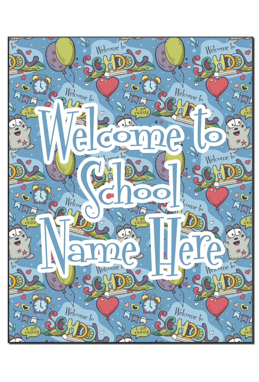 This design background is perfect for class room decor that welcomes student back to school! The background has a "Welcome to School" graphic along with a cartoon character that is ready for school, some balloons, hearts & airplanes. You can change the background color.