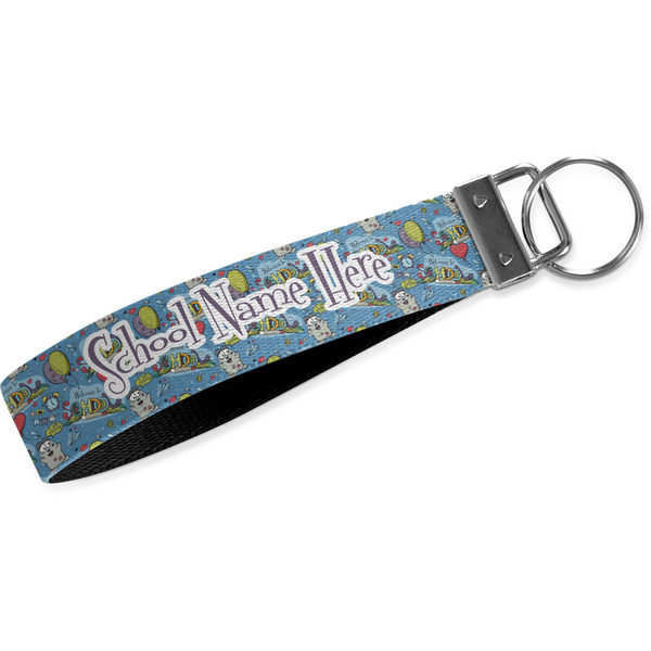 These key fob keychains are made from a polyester weave, right here in the USA. They feature a silver, metal clasp, attached to a round keyring. The piece gives the personalized wristlet a beautiful, finished look. Your customized design is printed on the outside of the keychain strap. We carry these wristlets in two sizes: small, which is 5 inches in width, and large, which is 5.5 inches in width.
