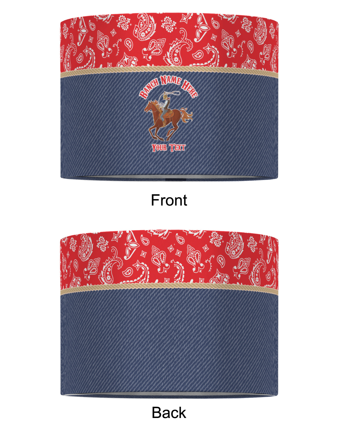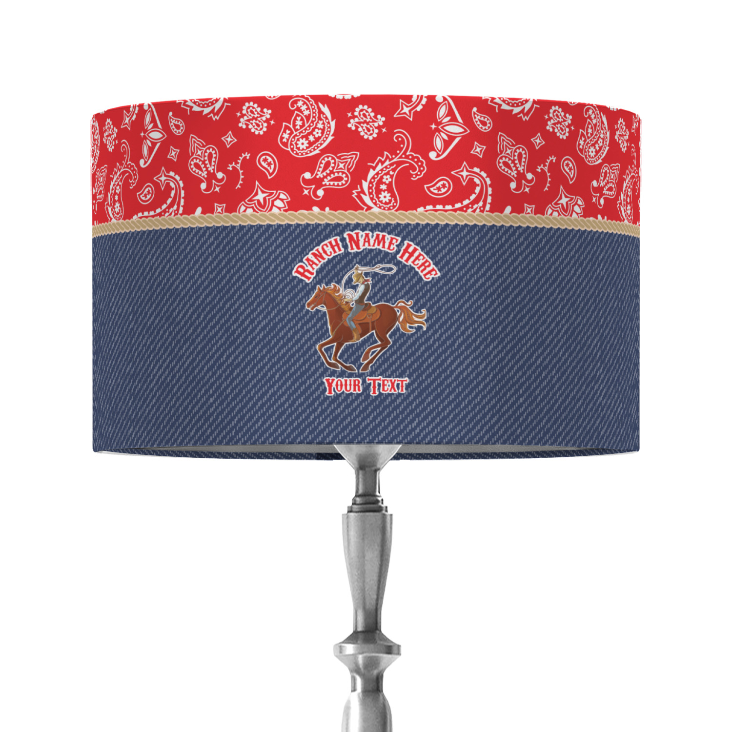 The design has two backgrounds where one fills up two thirds of the background and the other fills up the remaining third. The top third is a bright red paisley design that will get you smiling. The bottom two thirds is a denim pattern that feels like home. A rope ribbon divides the two backgrounds. On the bottom part is a roping cowboy graphic with your personalization above and below him.
