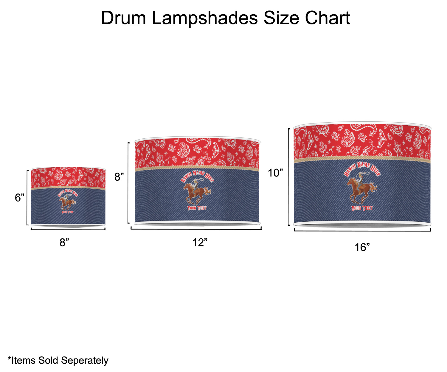 Our customized lamp shades also come in 3 different sizes: 8", 12" and 16", measuring at 8" in diameter by 6" tall, 12" in diameter by 8" tall, and 16" in diameter by 10" tall, respectively.