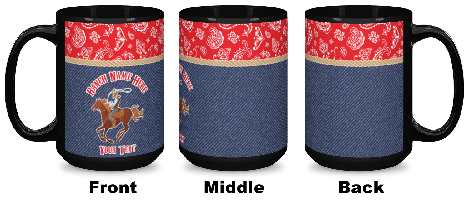 The design has two backgrounds where one fills up two thirds of the background and the other fills up the remaining third. The top third is a bright red paisley design that will get you smiling. The bottom two thirds is a denim pattern that feels like home. A rope ribbon divides the two backgrounds. On the bottom part is a roping cowboy graphic with your personalization above and below him.