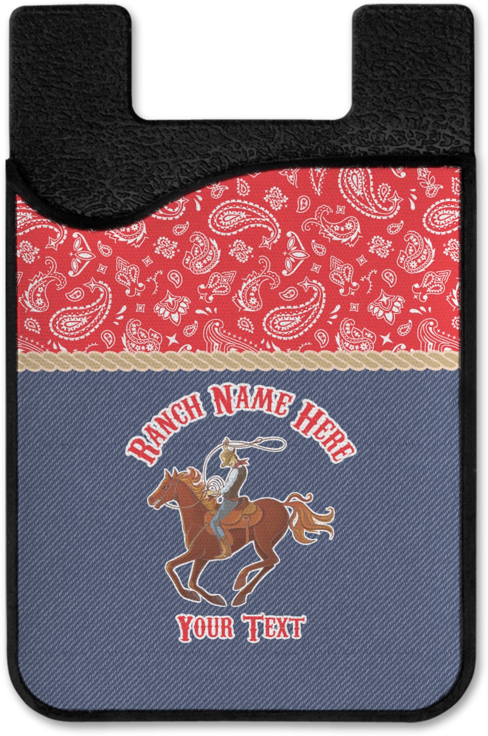 The design has two backgrounds where one fills up two thirds of the background and the other fills up the remaining third. The top third is a bright red paisley design that will get you smiling. The bottom two thirds is a denim pattern that feels like home. A rope ribbon divides the two backgrounds. On the bottom part is a roping cowboy graphic with your personalization above and below him.