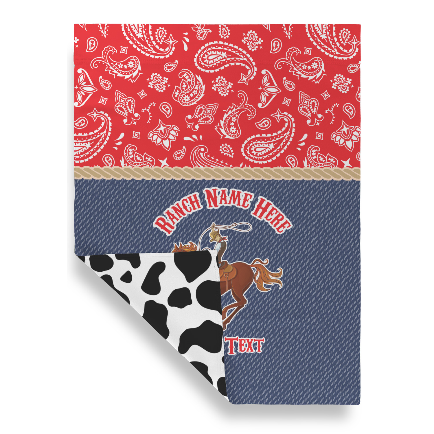 The design has two backgrounds where one fills up two thirds of the background and the other fills up the remaining third. The top third is a bright red paisley design that will get you smiling. The bottom two thirds is a denim pattern that feels like home. A rope ribbon divides the two backgrounds. On the bottom part is a roping cowboy graphic with your personalization above and below him.