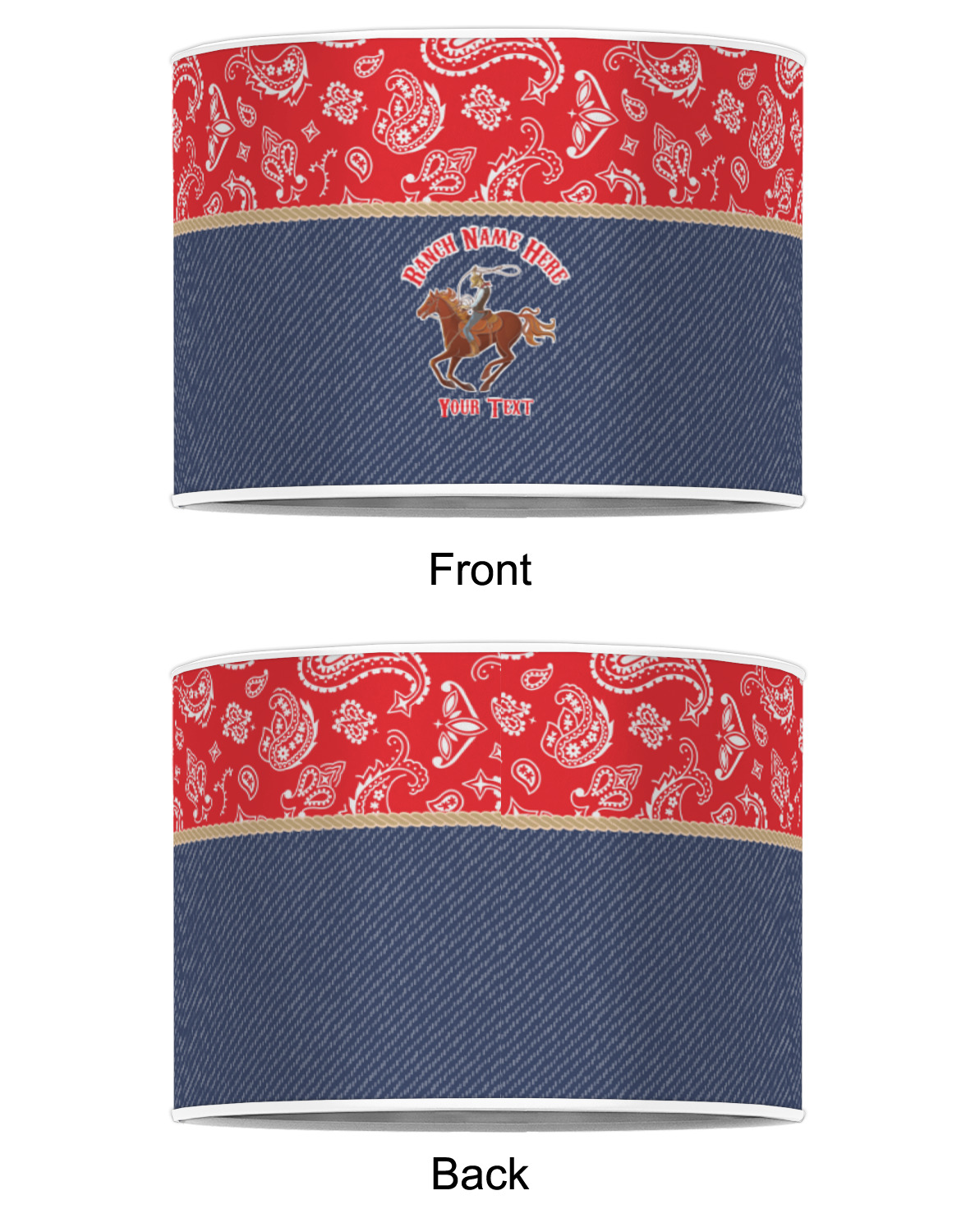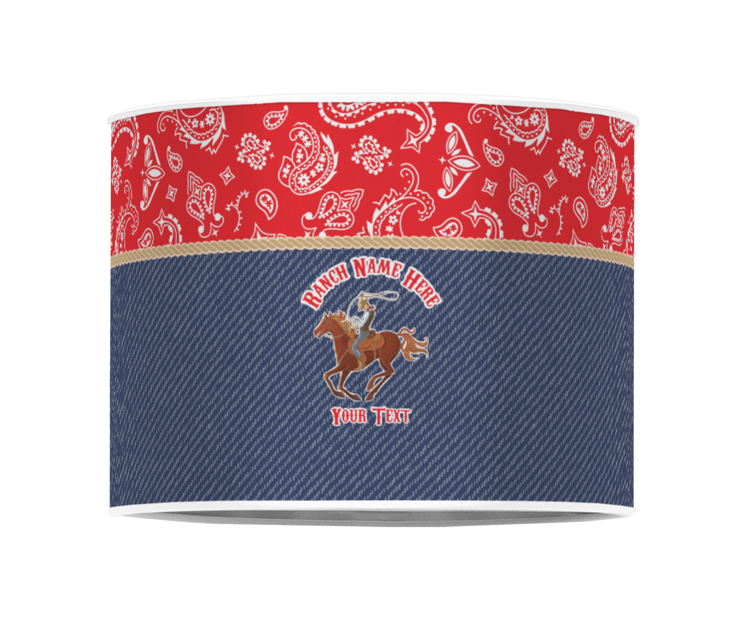 The design has two backgrounds where one fills up two thirds of the background and the other fills up the remaining third. The top third is a bright red paisley design that will get you smiling. The bottom two thirds is a denim pattern that feels like home. A rope ribbon divides the two backgrounds. On the bottom part is a roping cowboy graphic with your personalization above and below him.