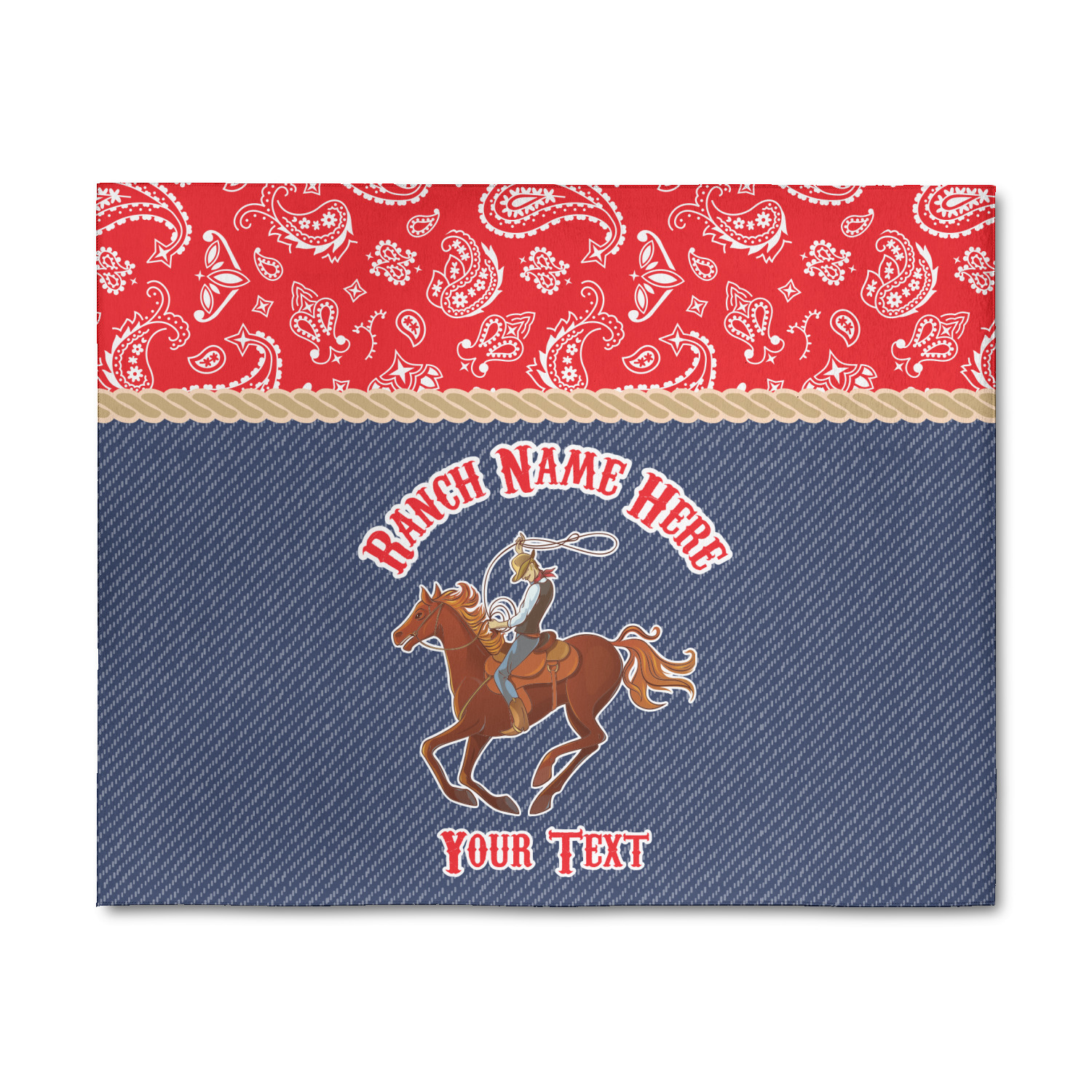 The design has two backgrounds where one fills up two thirds of the background and the other fills up the remaining third. The top third is a bright red paisley design that will get you smiling. The bottom two thirds is a denim pattern that feels like home. A rope ribbon divides the two backgrounds. On the bottom part is a roping cowboy graphic with your personalization above and below him.