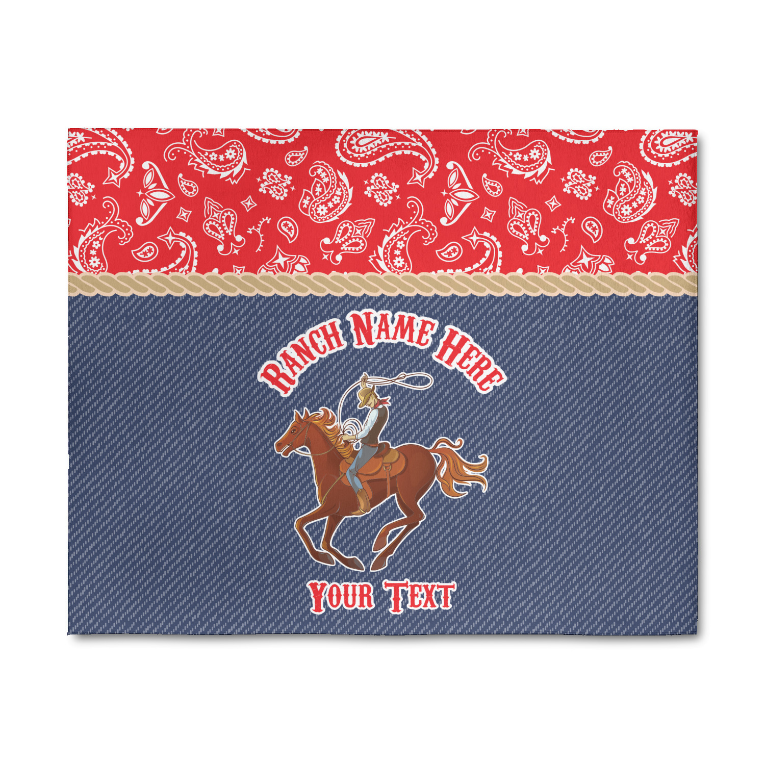 The design has two backgrounds where one fills up two thirds of the background and the other fills up the remaining third. The top third is a bright red paisley design that will get you smiling. The bottom two thirds is a denim pattern that feels like home. A rope ribbon divides the two backgrounds. On the bottom part is a roping cowboy graphic with your personalization above and below him.