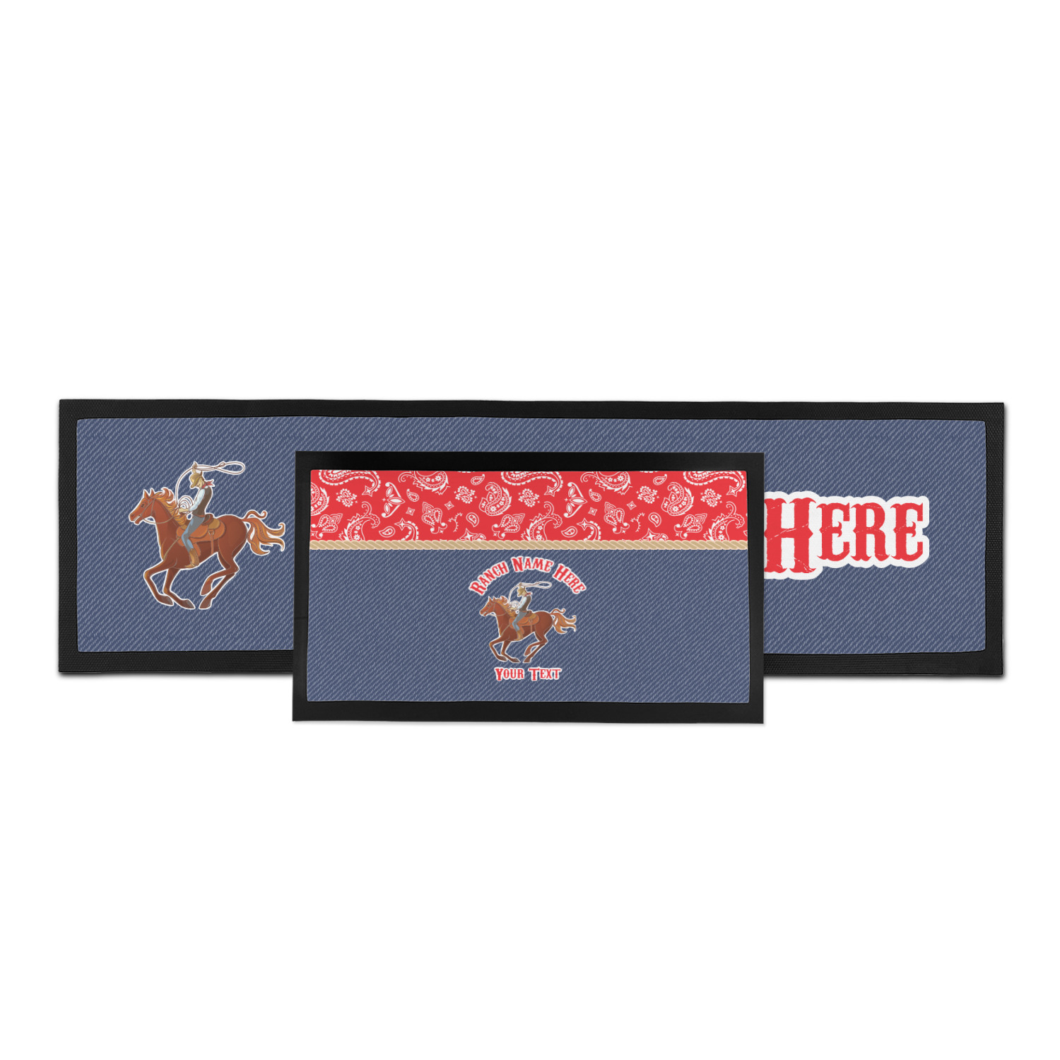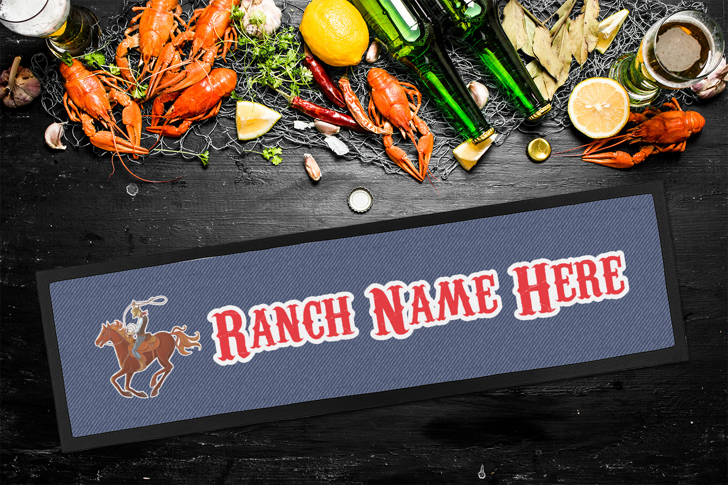 The design has two backgrounds where one fills up two thirds of the background and the other fills up the remaining third. The top third is a bright red paisley design that will get you smiling. The bottom two thirds is a denim pattern that feels like home. A rope ribbon divides the two backgrounds. On the bottom part is a roping cowboy graphic with your personalization above and below him.