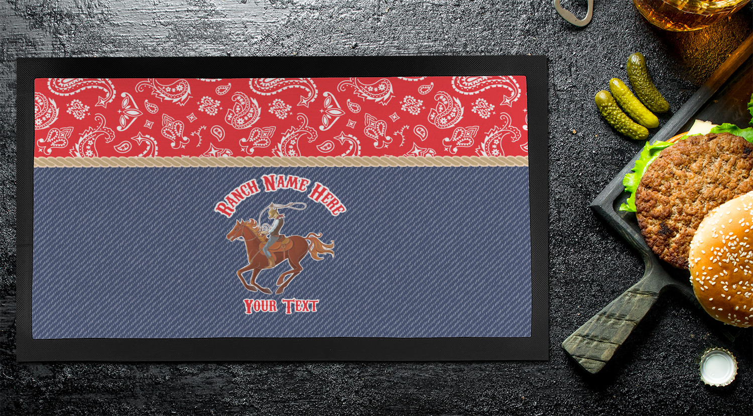 The design has two backgrounds where one fills up two thirds of the background and the other fills up the remaining third. The top third is a bright red paisley design that will get you smiling. The bottom two thirds is a denim pattern that feels like home. A rope ribbon divides the two backgrounds. On the bottom part is a roping cowboy graphic with your personalization above and below him.
