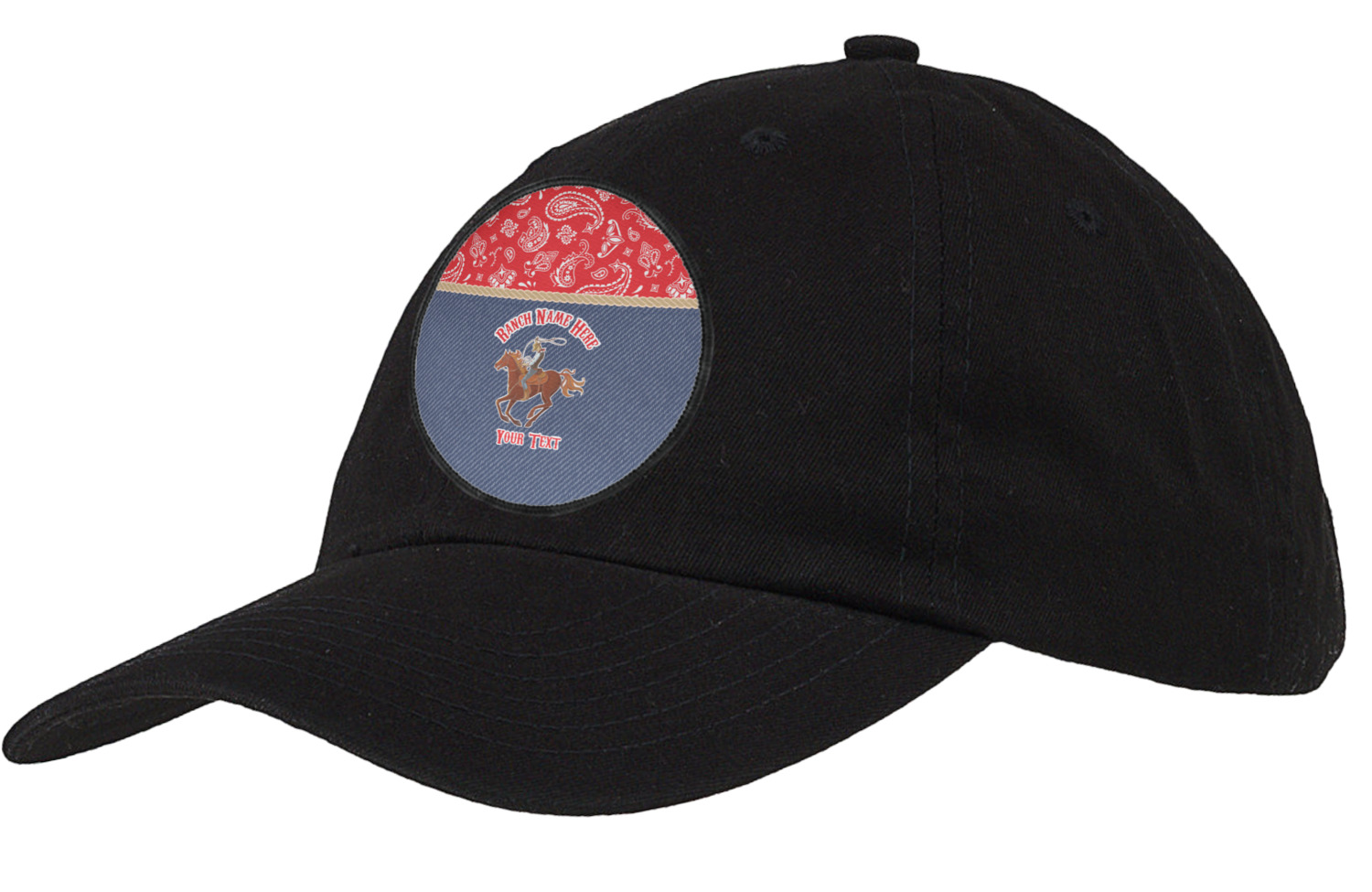 The design has two backgrounds where one fills up two thirds of the background and the other fills up the remaining third. The top third is a bright red paisley design that will get you smiling. The bottom two thirds is a denim pattern that feels like home. A rope ribbon divides the two backgrounds. On the bottom part is a roping cowboy graphic with your personalization above and below him.