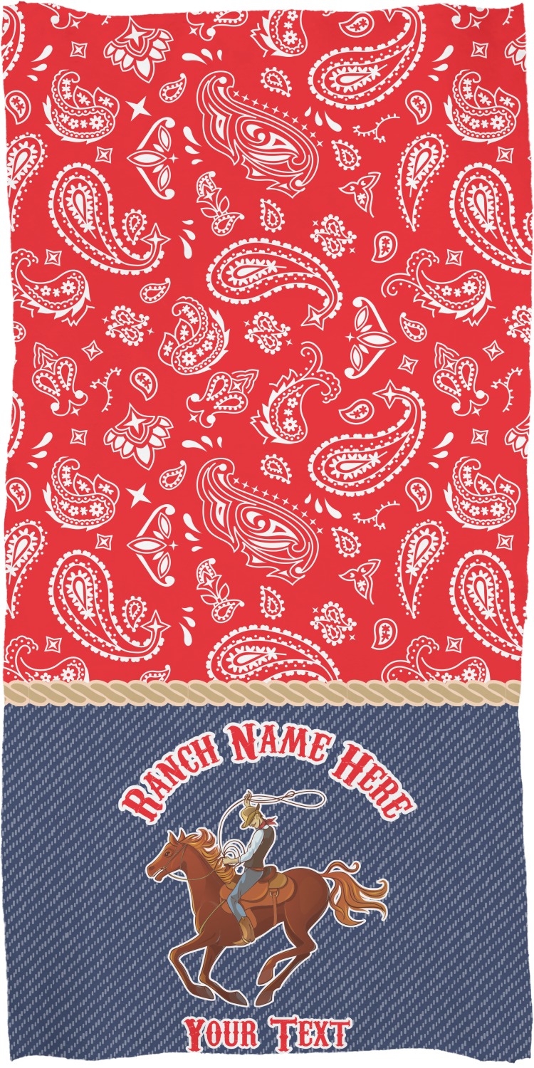 The design has two backgrounds where one fills up two thirds of the background and the other fills up the remaining third. The top third is a bright red paisley design that will get you smiling. The bottom two thirds is a denim pattern that feels like home. A rope ribbon divides the two backgrounds. On the bottom part is a roping cowboy graphic with your personalization above and below him.