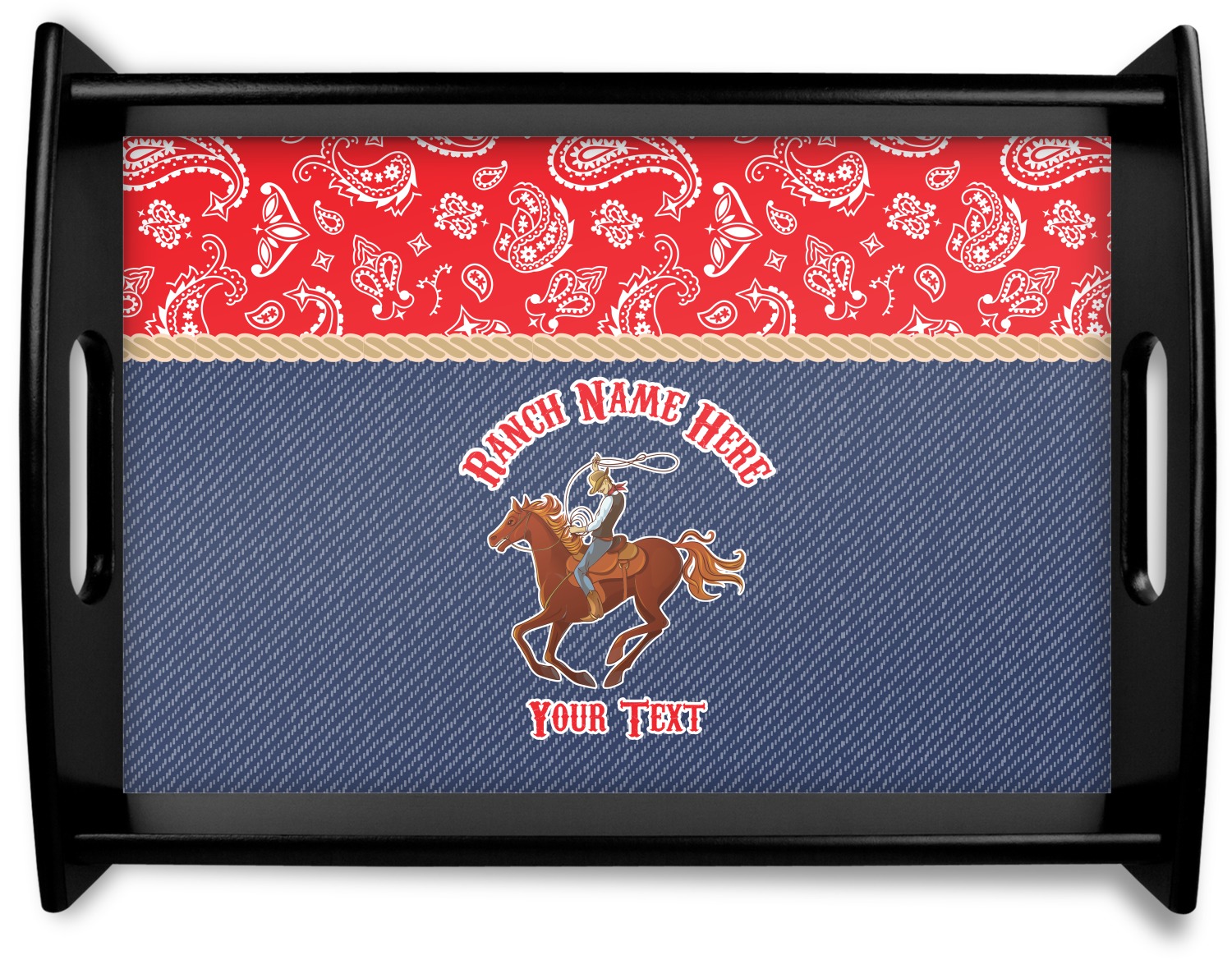 The design has two backgrounds where one fills up two thirds of the background and the other fills up the remaining third. The top third is a bright red paisley design that will get you smiling. The bottom two thirds is a denim pattern that feels like home. A rope ribbon divides the two backgrounds. On the bottom part is a roping cowboy graphic with your personalization above and below him.