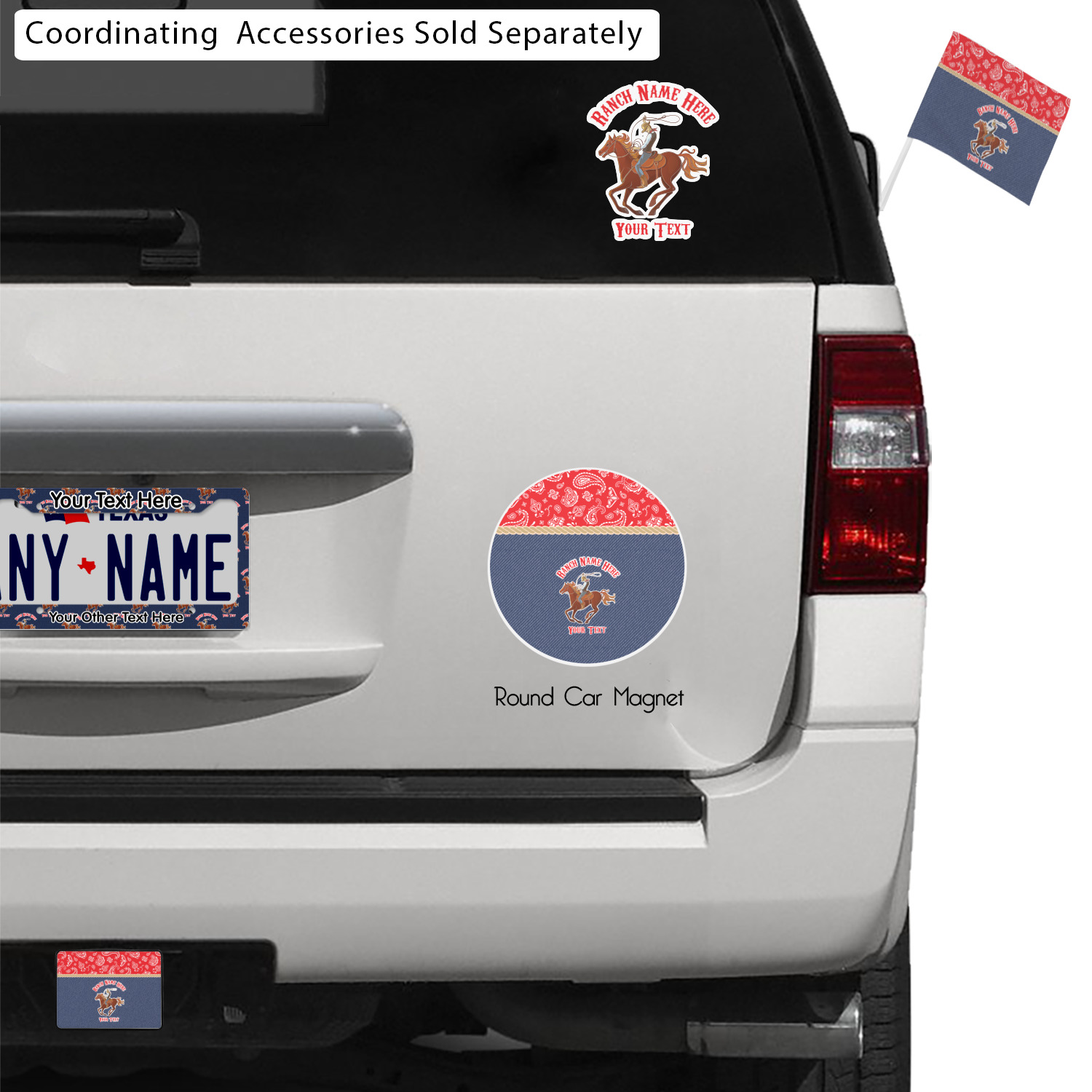 The design has two backgrounds where one fills up two thirds of the background and the other fills up the remaining third. The top third is a bright red paisley design that will get you smiling. The bottom two thirds is a denim pattern that feels like home. A rope ribbon divides the two backgrounds. On the bottom part is a roping cowboy graphic with your personalization above and below him.