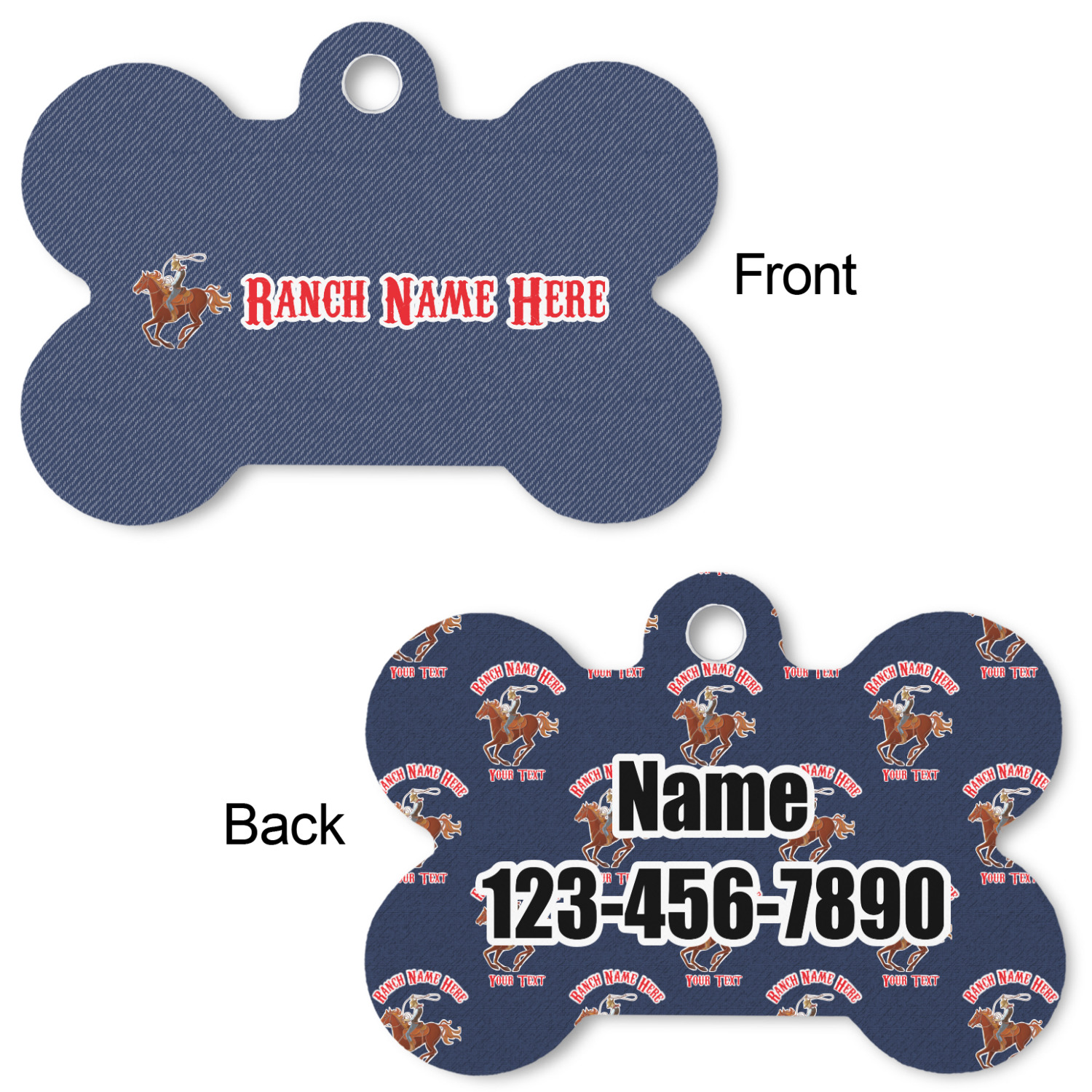Our default design templates print your dog's personalization on the front and your contact information on the back; however everything is customizable, so you customize the patterns, the colors, the personalization, the contact information etc.