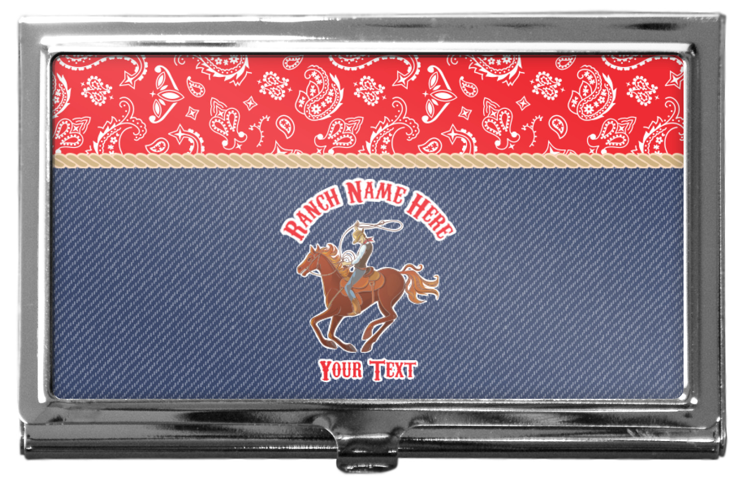 The design has two backgrounds where one fills up two thirds of the background and the other fills up the remaining third. The top third is a bright red paisley design that will get you smiling. The bottom two thirds is a denim pattern that feels like home. A rope ribbon divides the two backgrounds. On the bottom part is a roping cowboy graphic with your personalization above and below him.