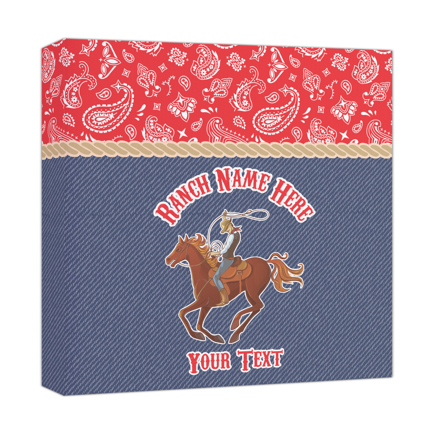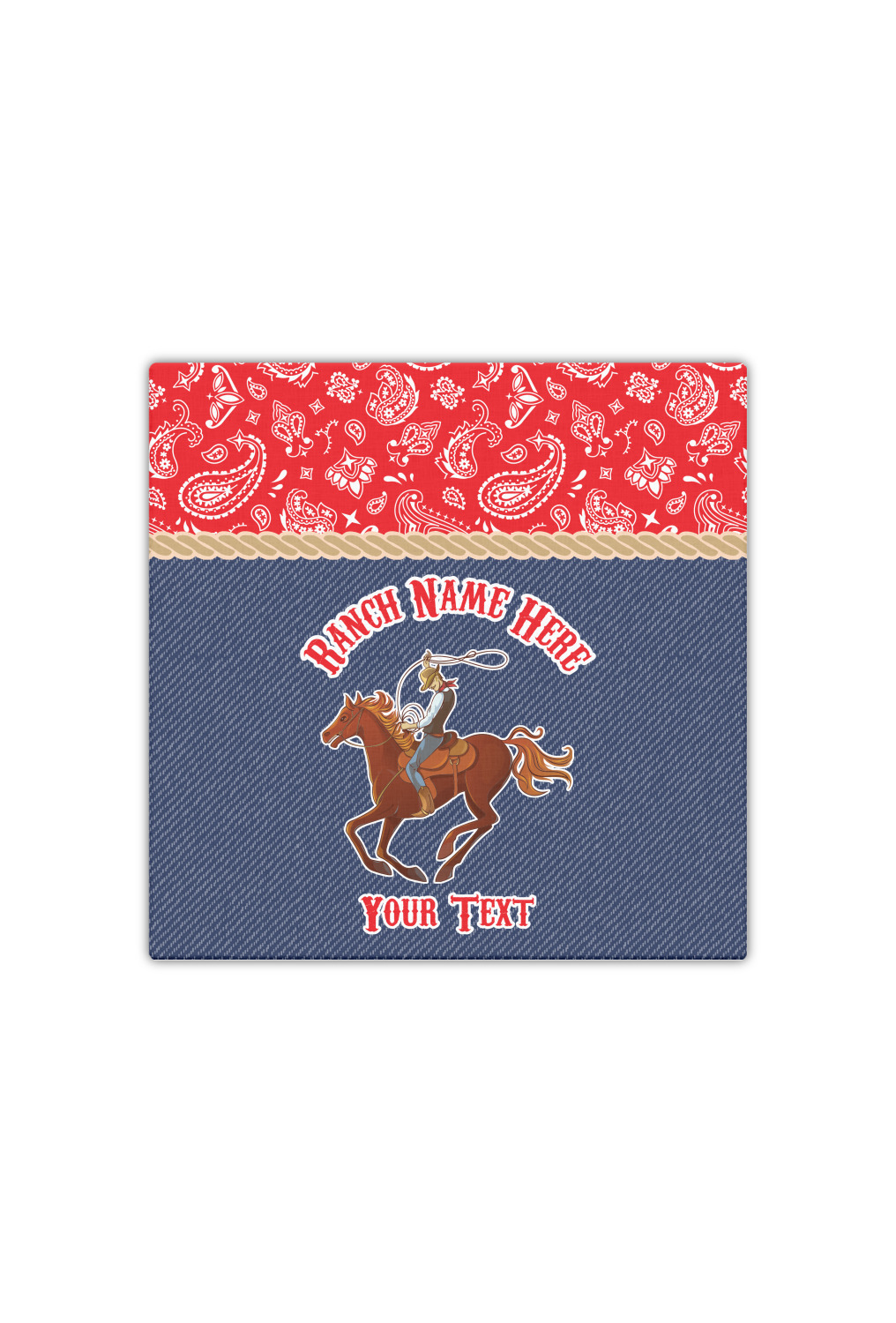 The design has two backgrounds where one fills up two thirds of the background and the other fills up the remaining third. The top third is a bright red paisley design that will get you smiling. The bottom two thirds is a denim pattern that feels like home. A rope ribbon divides the two backgrounds. On the bottom part is a roping cowboy graphic with your personalization above and below him.