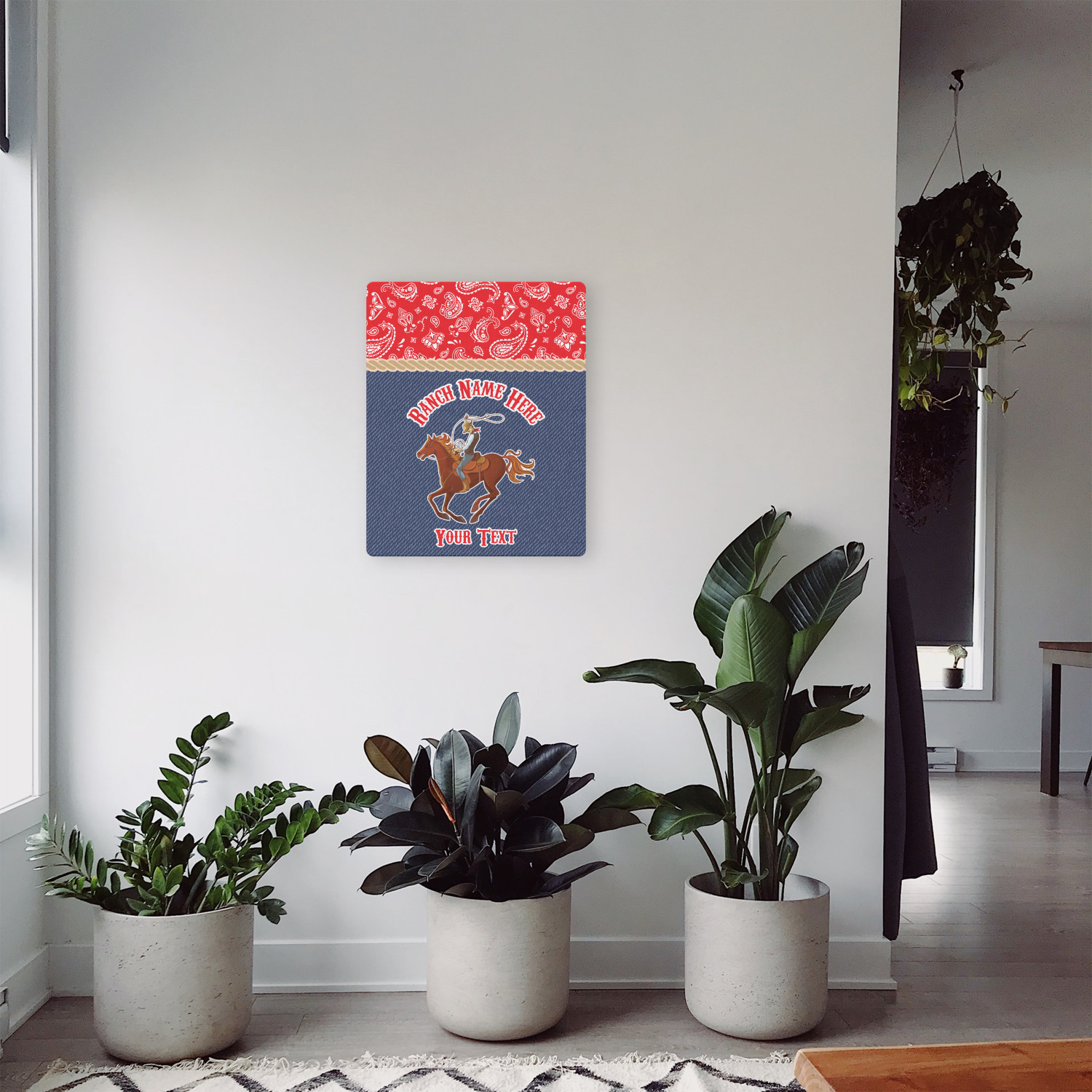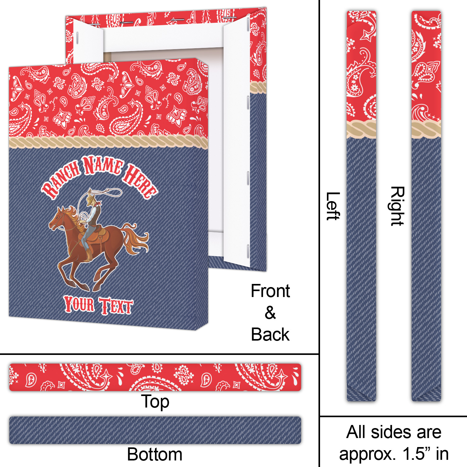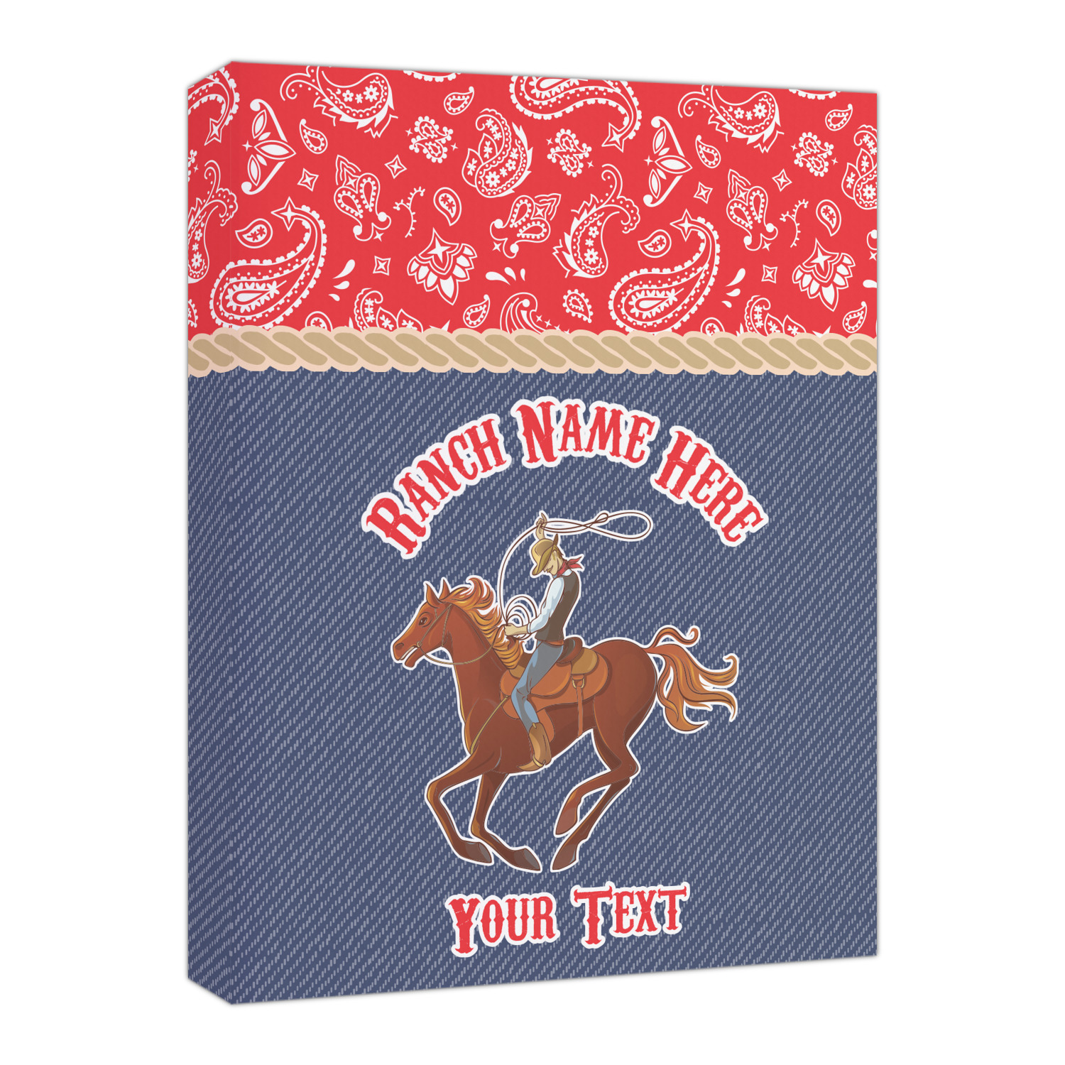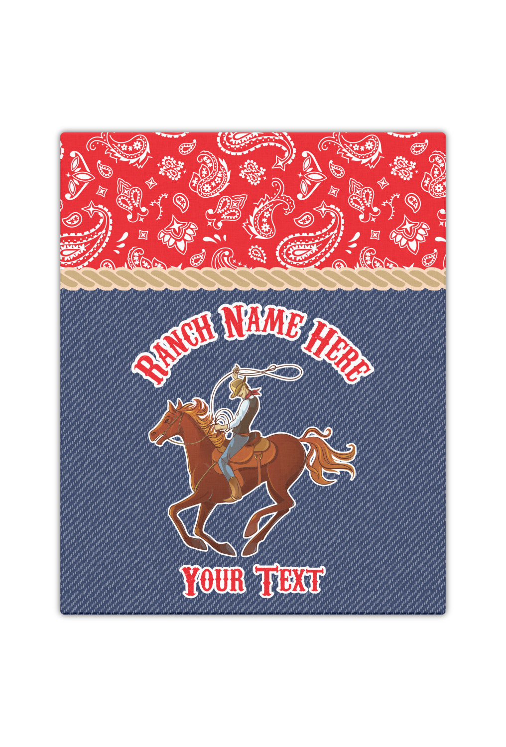 The design has two backgrounds where one fills up two thirds of the background and the other fills up the remaining third. The top third is a bright red paisley design that will get you smiling. The bottom two thirds is a denim pattern that feels like home. A rope ribbon divides the two backgrounds. On the bottom part is a roping cowboy graphic with your personalization above and below him.