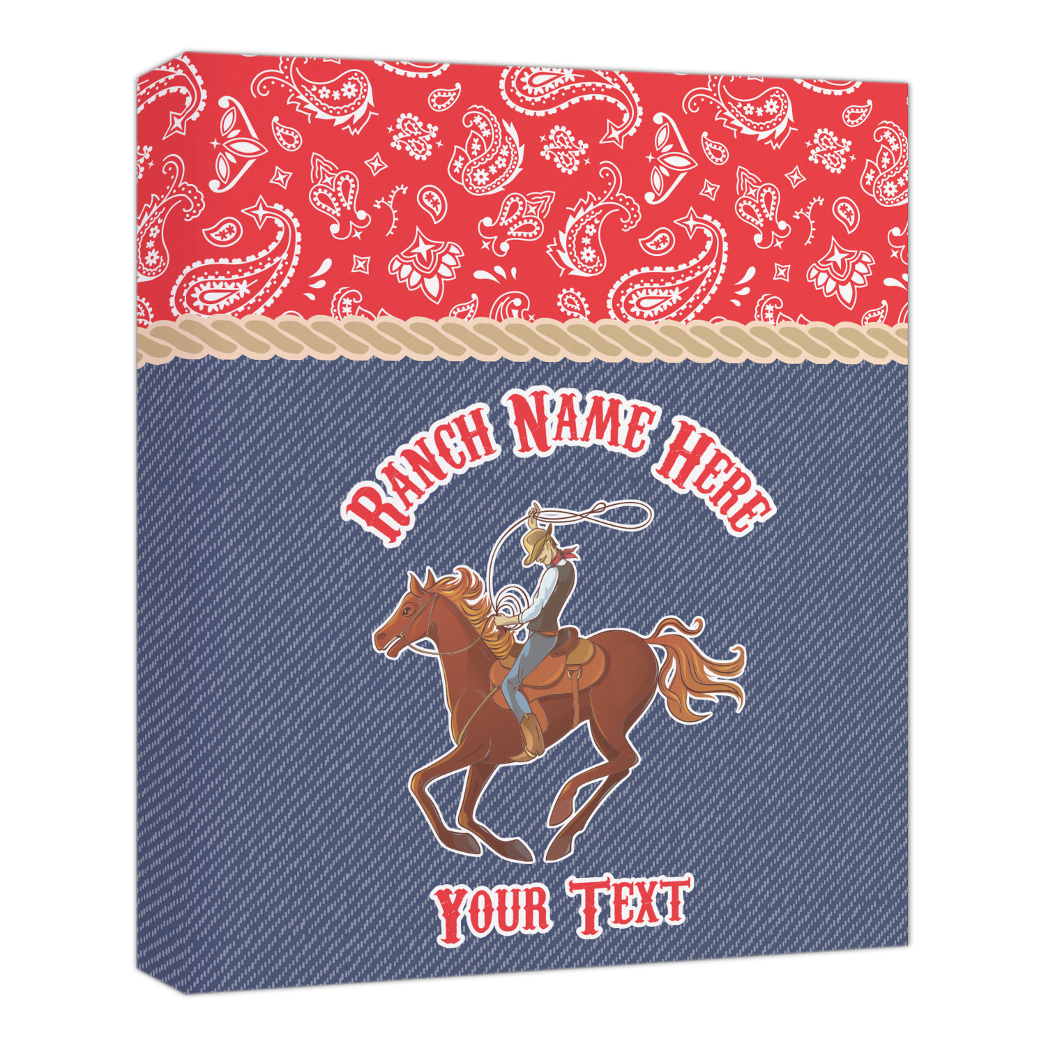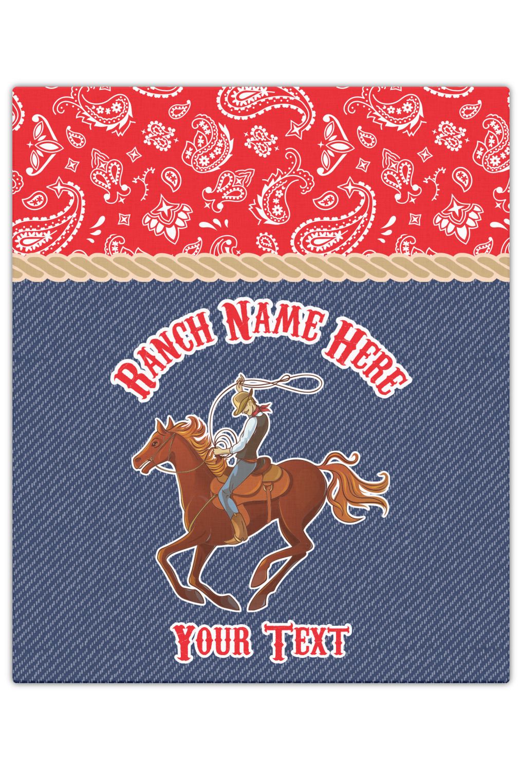The design has two backgrounds where one fills up two thirds of the background and the other fills up the remaining third. The top third is a bright red paisley design that will get you smiling. The bottom two thirds is a denim pattern that feels like home. A rope ribbon divides the two backgrounds. On the bottom part is a roping cowboy graphic with your personalization above and below him.