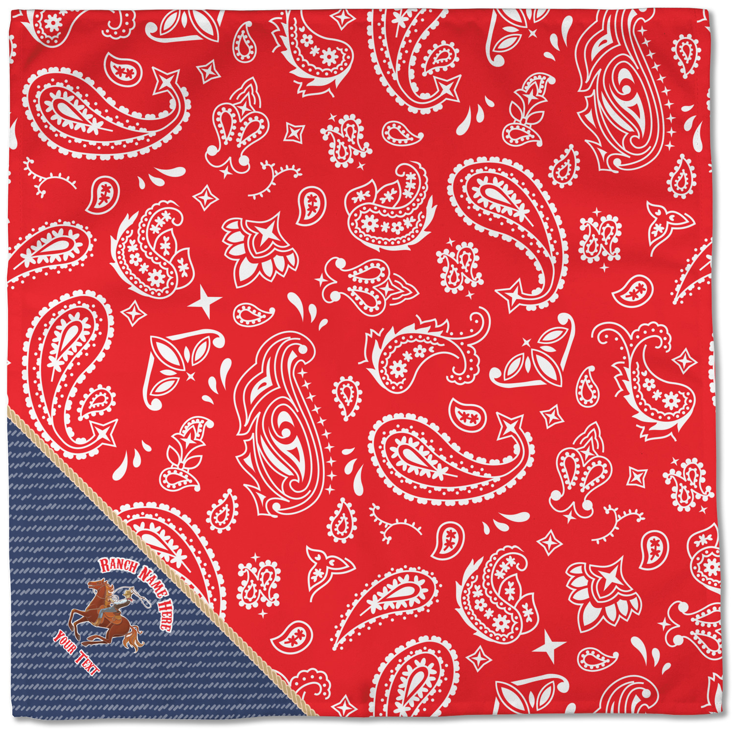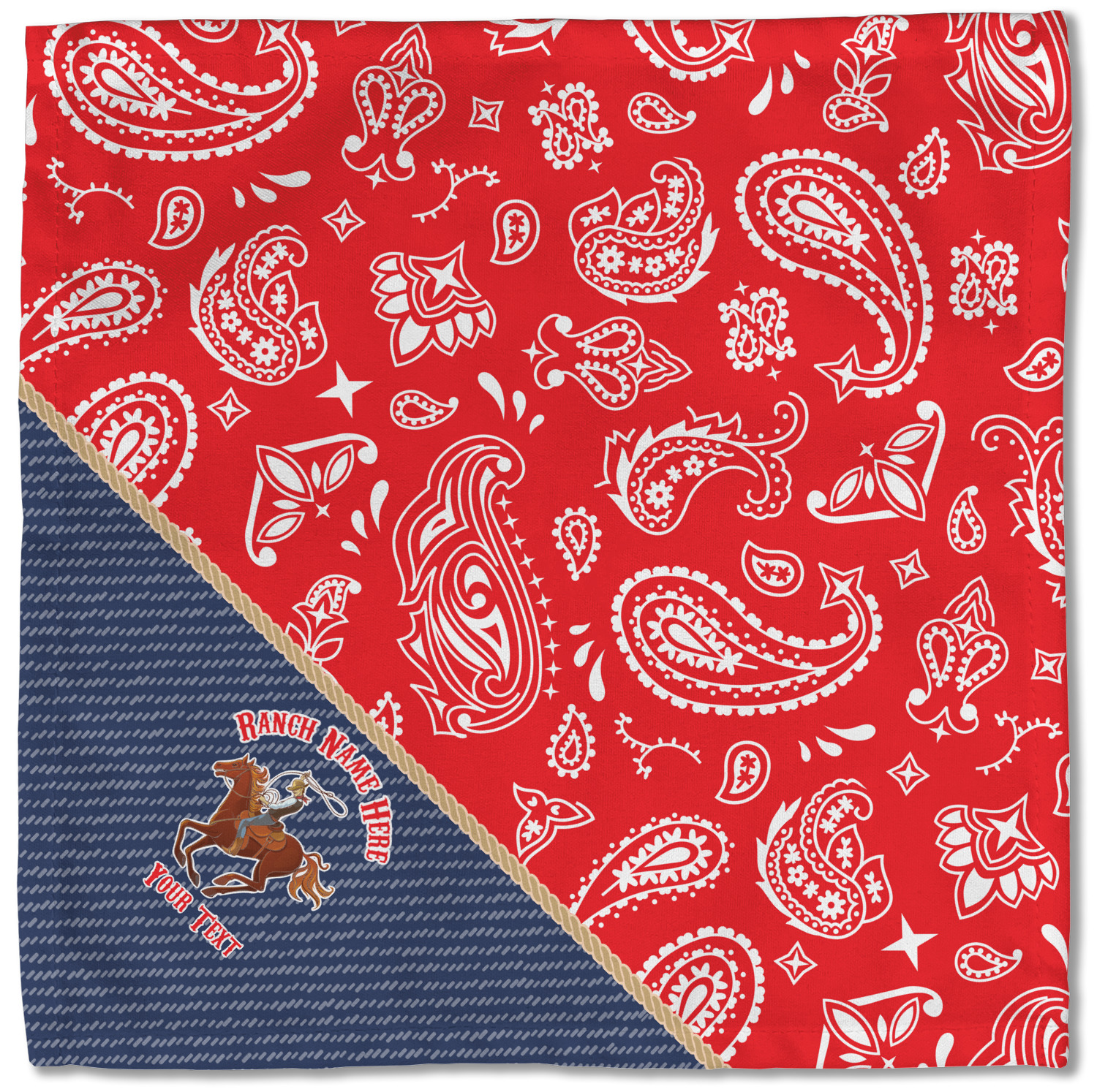 The design has two backgrounds where one fills up two thirds of the background and the other fills up the remaining third. The top third is a bright red paisley design that will get you smiling. The bottom two thirds is a denim pattern that feels like home. A rope ribbon divides the two backgrounds. On the bottom part is a roping cowboy graphic with your personalization above and below him.