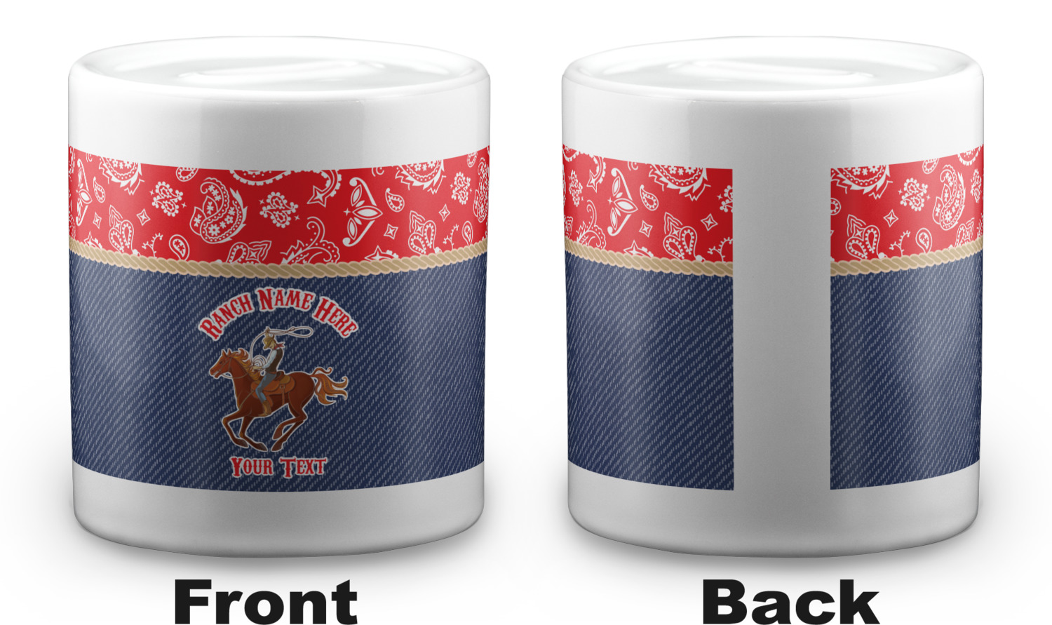 The design has two backgrounds where one fills up two thirds of the background and the other fills up the remaining third. The top third is a bright red paisley design that will get you smiling. The bottom two thirds is a denim pattern that feels like home. A rope ribbon divides the two backgrounds. On the bottom part is a roping cowboy graphic with your personalization above and below him.
