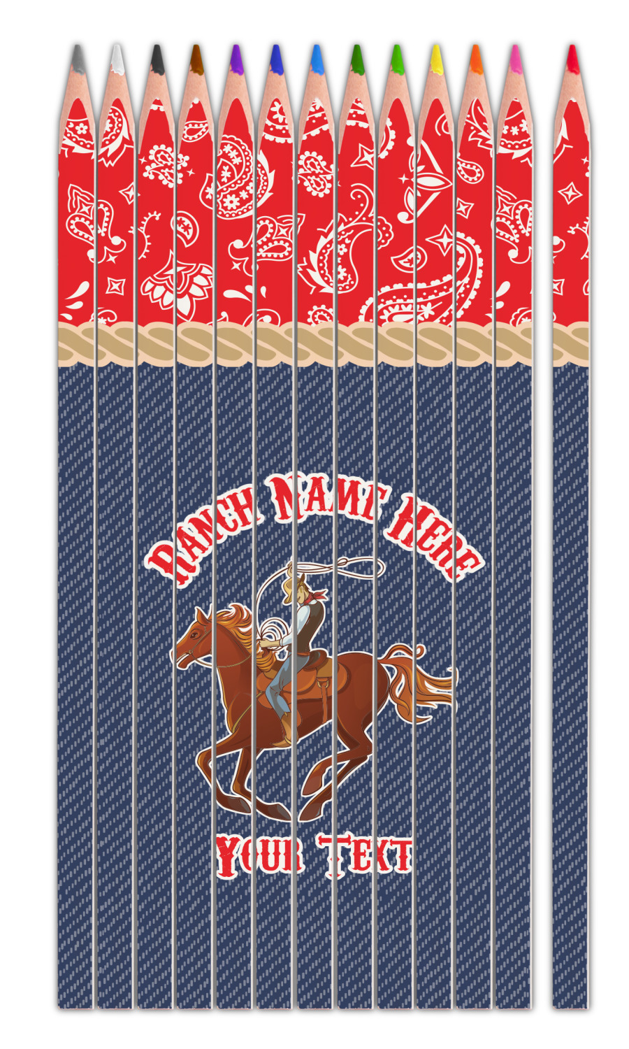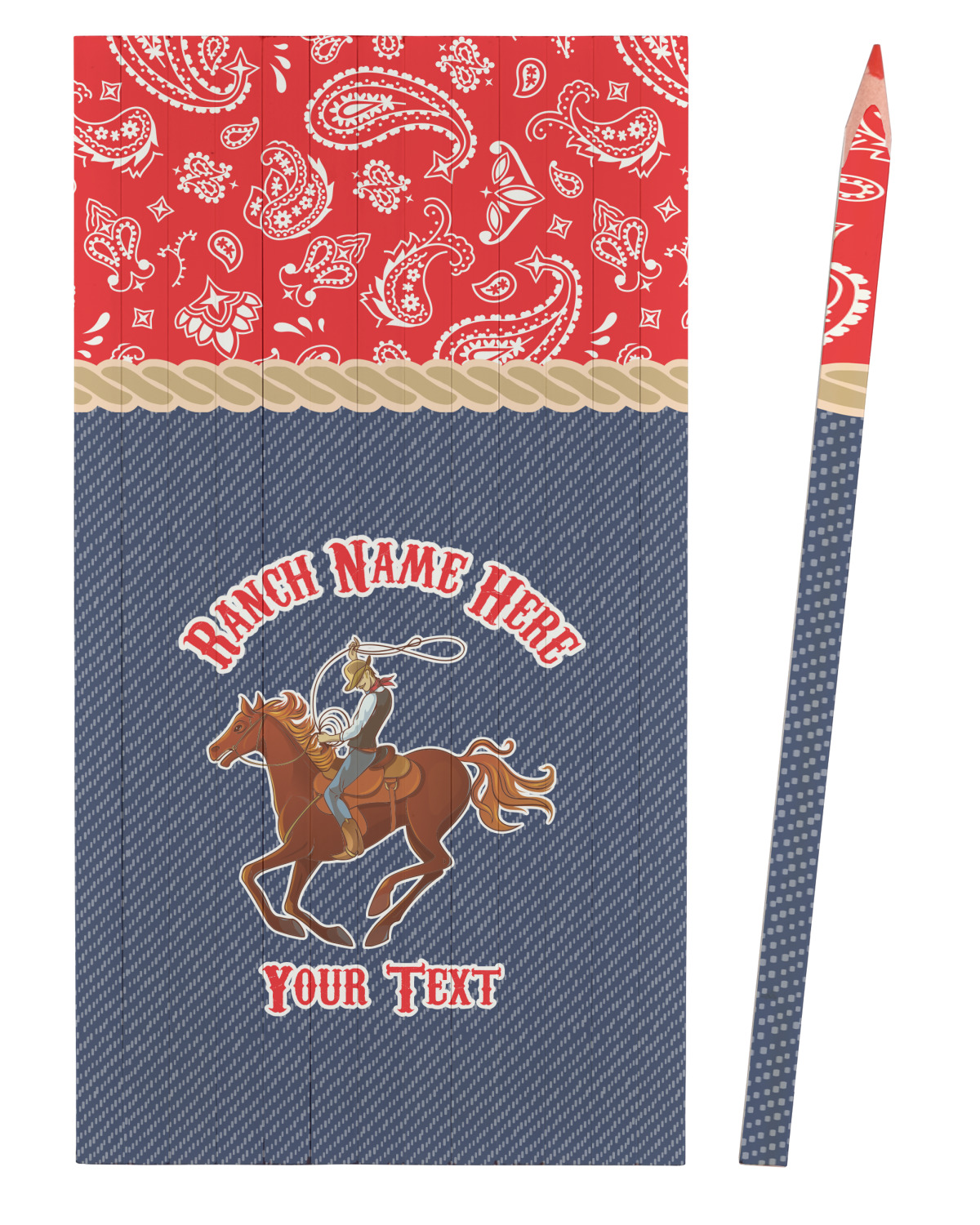 The design has two backgrounds where one fills up two thirds of the background and the other fills up the remaining third. The top third is a bright red paisley design that will get you smiling. The bottom two thirds is a denim pattern that feels like home. A rope ribbon divides the two backgrounds. On the bottom part is a roping cowboy graphic with your personalization above and below him.
