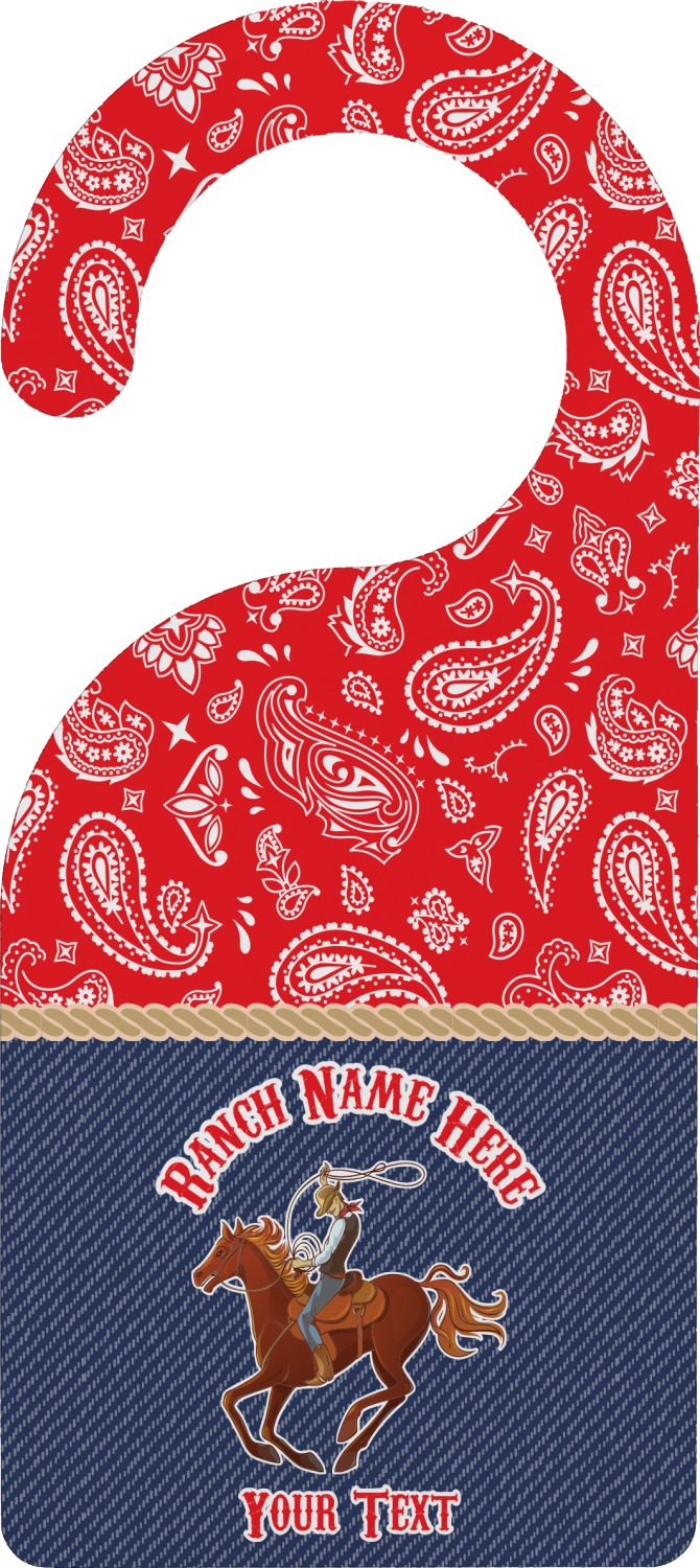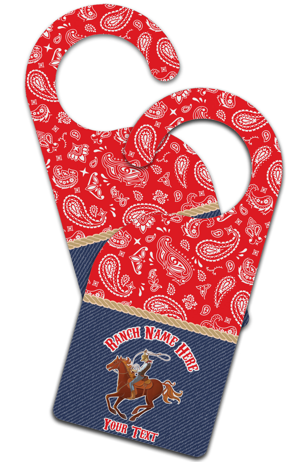The design has two backgrounds where one fills up two thirds of the background and the other fills up the remaining third. The top third is a bright red paisley design that will get you smiling. The bottom two thirds is a denim pattern that feels like home. A rope ribbon divides the two backgrounds. On the bottom part is a roping cowboy graphic with your personalization above and below him.