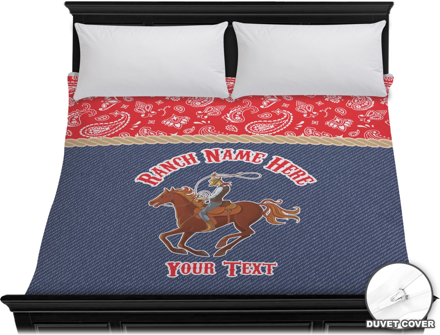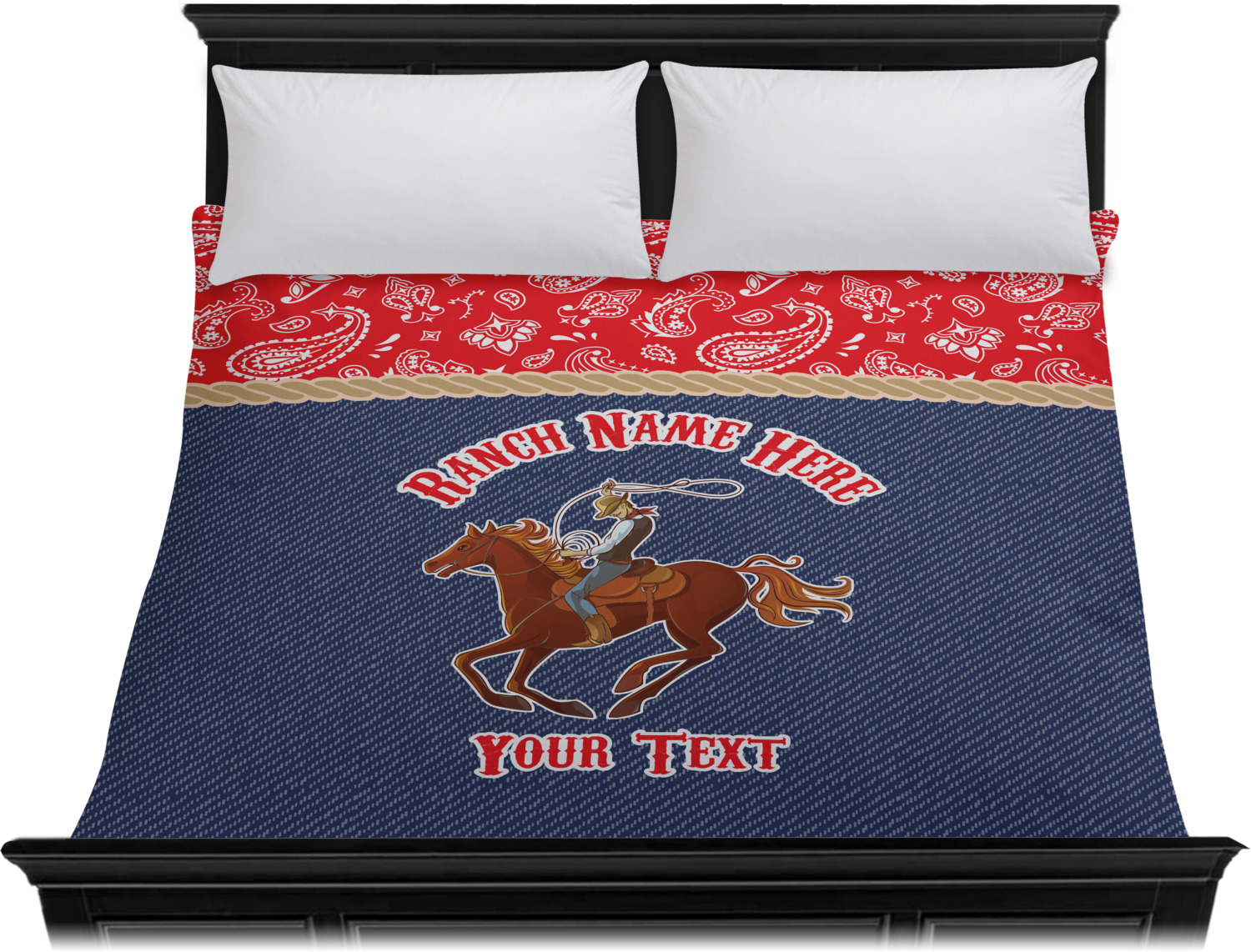 The design has two backgrounds where one fills up two thirds of the background and the other fills up the remaining third. The top third is a bright red paisley design that will get you smiling. The bottom two thirds is a denim pattern that feels like home. A rope ribbon divides the two backgrounds. On the bottom part is a roping cowboy graphic with your personalization above and below him.