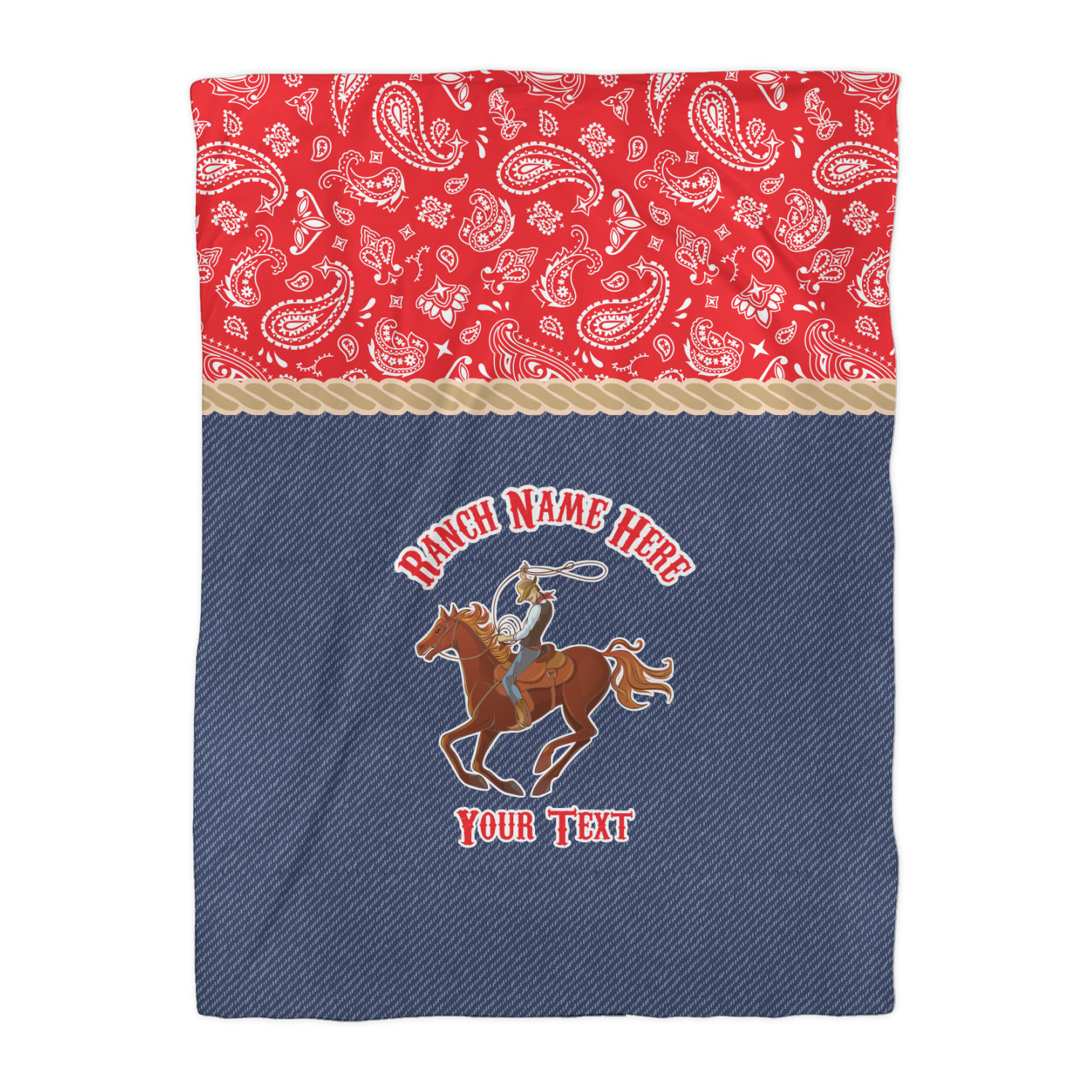 The design has two backgrounds where one fills up two thirds of the background and the other fills up the remaining third. The top third is a bright red paisley design that will get you smiling. The bottom two thirds is a denim pattern that feels like home. A rope ribbon divides the two backgrounds. On the bottom part is a roping cowboy graphic with your personalization above and below him.