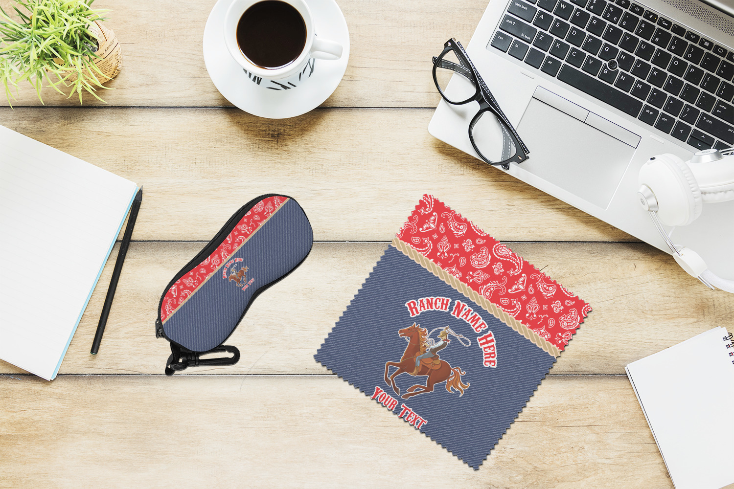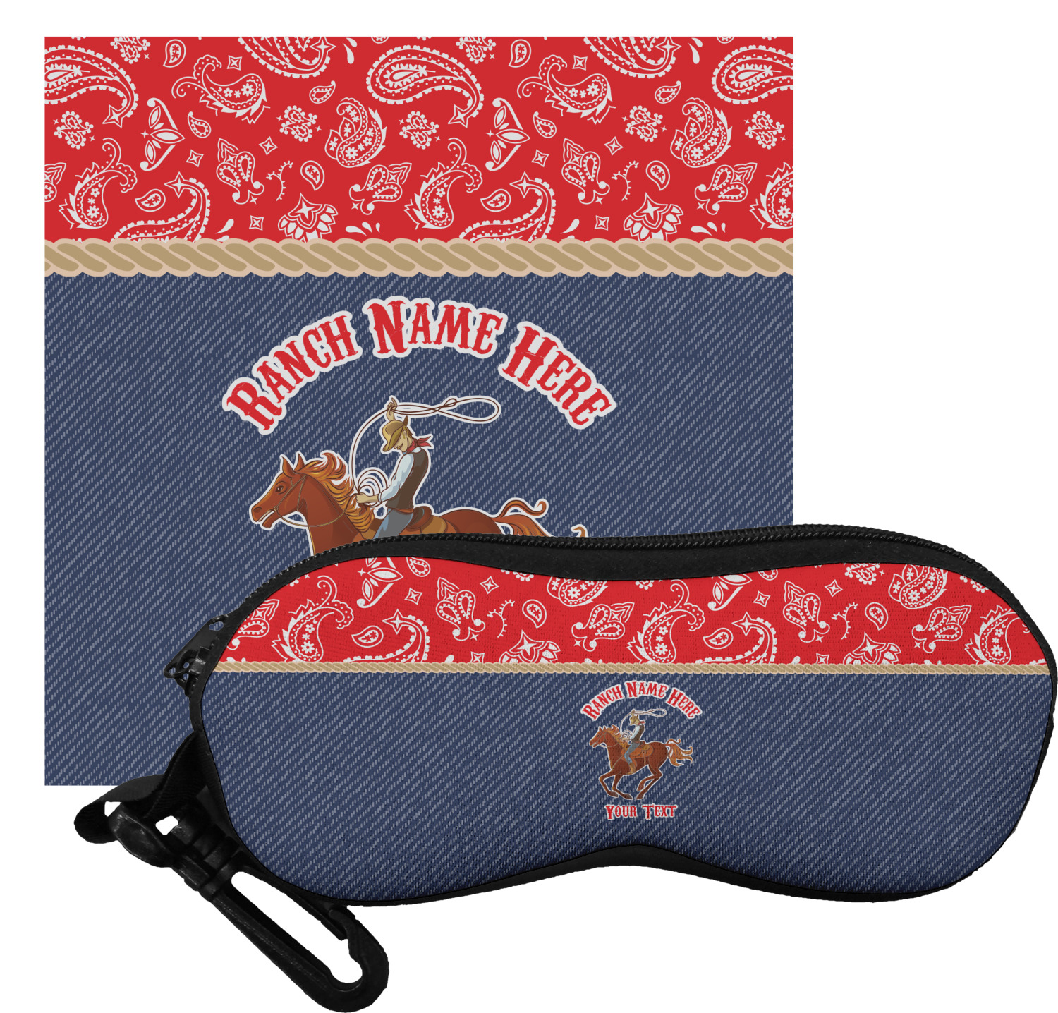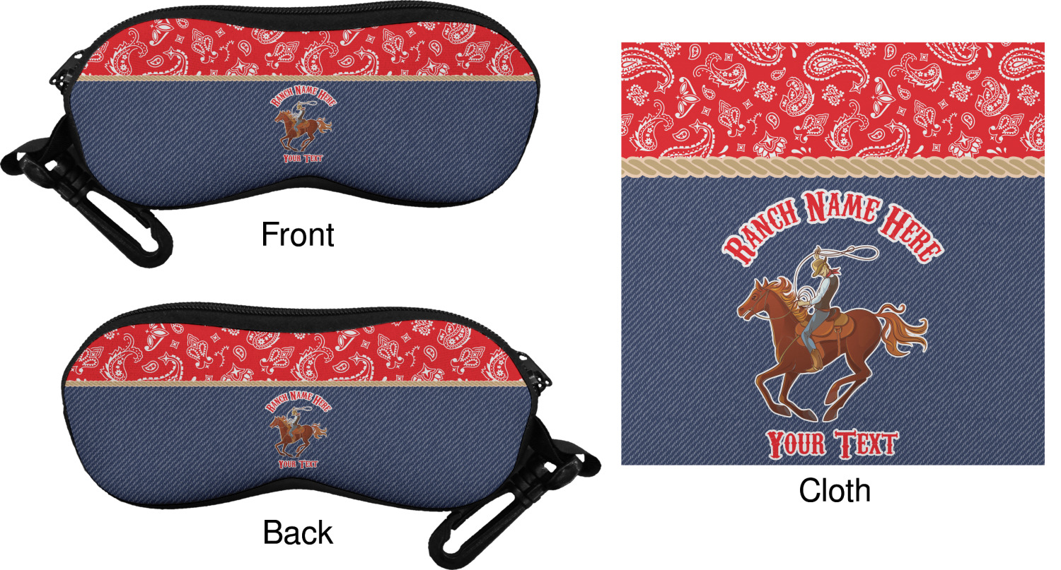 The design has two backgrounds where one fills up two thirds of the background and the other fills up the remaining third. The top third is a bright red paisley design that will get you smiling. The bottom two thirds is a denim pattern that feels like home. A rope ribbon divides the two backgrounds. On the bottom part is a roping cowboy graphic with your personalization above and below him.