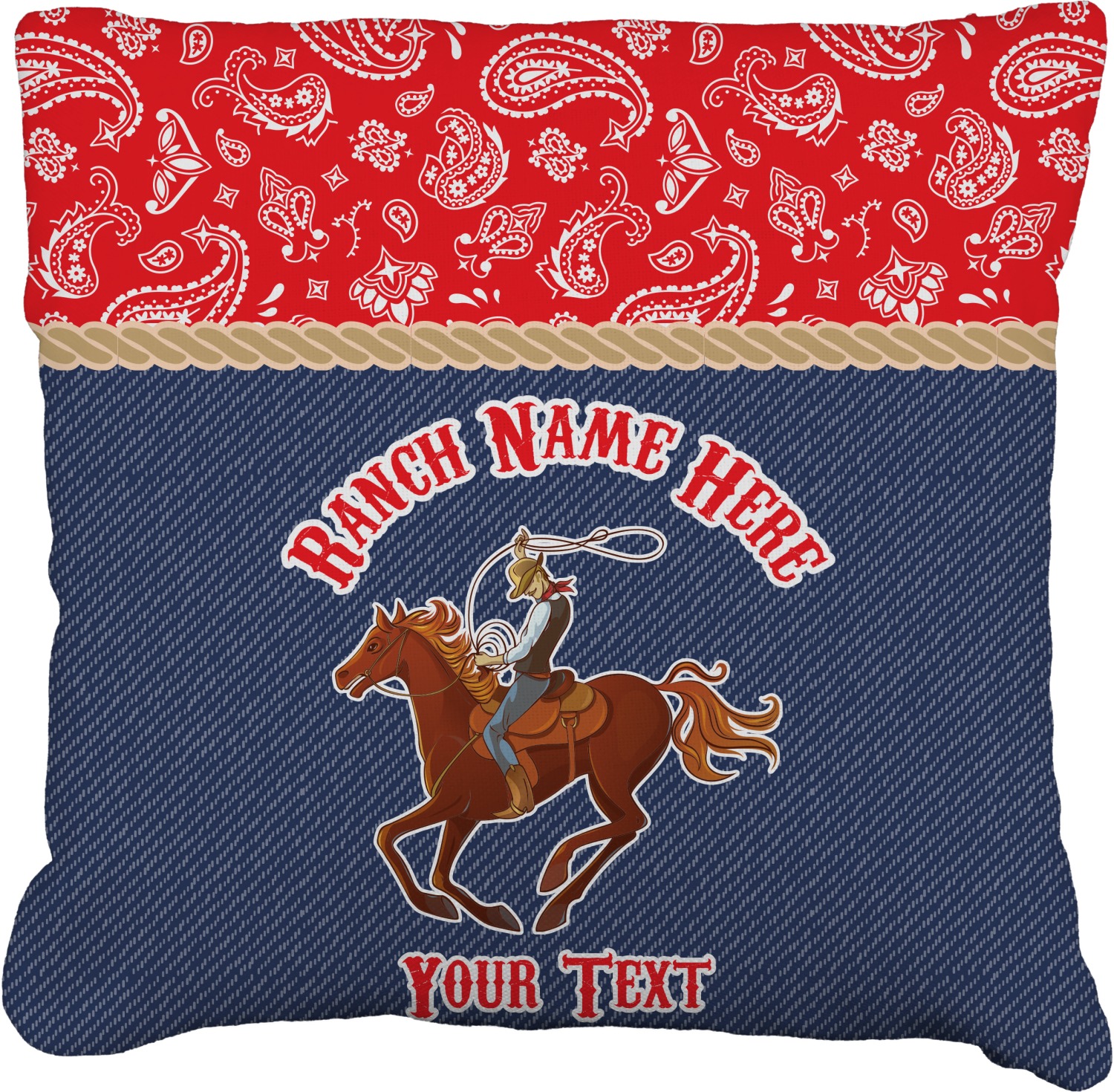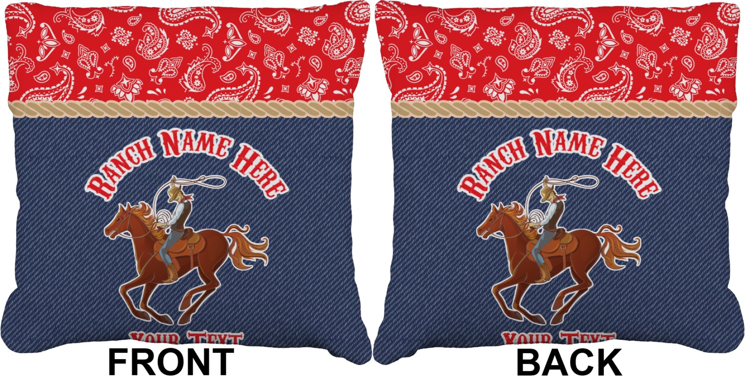 The design has two backgrounds where one fills up two thirds of the background and the other fills up the remaining third. The top third is a bright red paisley design that will get you smiling. The bottom two thirds is a denim pattern that feels like home. A rope ribbon divides the two backgrounds. On the bottom part is a roping cowboy graphic with your personalization above and below him.