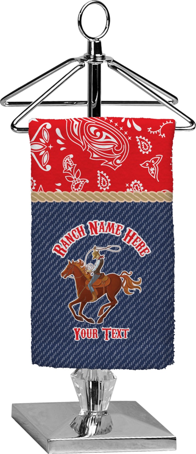 The design has two backgrounds where one fills up two thirds of the background and the other fills up the remaining third. The top third is a bright red paisley design that will get you smiling. The bottom two thirds is a denim pattern that feels like home. A rope ribbon divides the two backgrounds. On the bottom part is a roping cowboy graphic with your personalization above and below him.